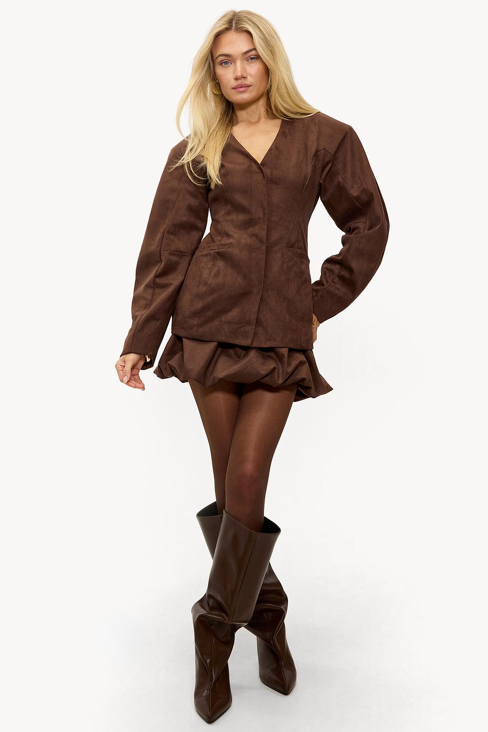 Ce blazer marron foncé effet suédine a une coupe ajustée avec des revers affirmés et une fermeture à double bouton. La coupe oversize avec des détails de poche et une ceinture crée un look luxueux. Associez ce blazer à la mini-jupe assortie pour un look coordonné chic.
