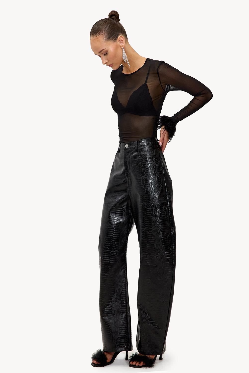 Ce pantalon noir à coupe ballon a un aspect cuir embossé croco luxueux pour une allure affirmée. La coupe ballon taille haute crée une forme audacieuse qui s'aligne parfaitement avec les tendances actuelles. Le style à 5 poches et la fermeture à boutons donnent à ce pantalon une touche moderne. Associez ce pantalon avec un haut transparent pour un look de soirée audacieux.