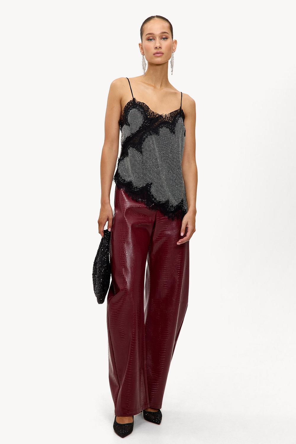 Ce pantalon bordeaux à jambes larges présente un imprimé crocodile luxueux en cuir végétalien pour un look affirmé. La coupe taille haute avec jambes larges crée une apparence chic avec une touche audacieuse. La finition texturée donne à ce pantalon une touche sophistiquée. Associez ce pantalon avec un crop top noir et des talons pointus pour un look de dîner iconique.
