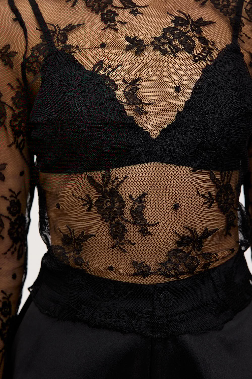 Ce haut en mesh noir présente un design en dentelle luxueux avec des détails transparents subtils partout. Les manches longues et le col montant donnent à ce haut une touche chic. La coupe ajustée accentue élégamment la silhouette. Associez ce haut statement avec une mini-jupe en similicuir pour un look iconique de soirée entre filles.