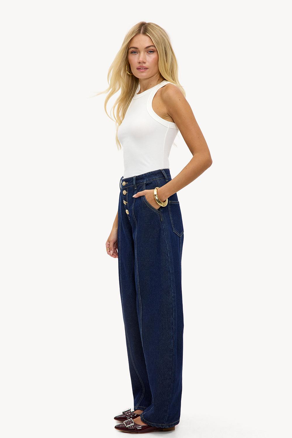 Ce jean à jambes larges présente une coupe ballon saisissante avec des boutons dorés sur le devant. La coupe taille haute avec jambes larges crée une ambiance rétro cool. Le lavage denim bleu foncé et les coutures contrastées décoratives donnent à ce jean une touche vintage. Associez ce denim audacieux avec une blouse blanche pour un look chic et décontracté.
