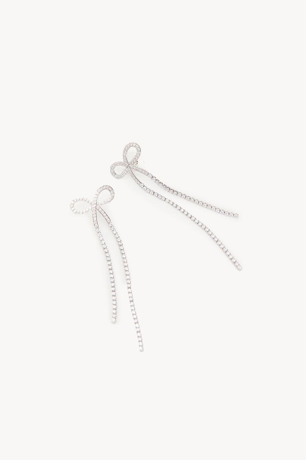 Ces boucles d'oreilles en argent à effet de style présentent un design de nœud frappant avec des détails scintillants partout. Les longues chaînes pendantes avec des accents brillants créent du mouvement et une apparence luxueuse. Le motif de nœud donne à ces boucles d'oreilles une touche féminine avec une touche moderne. Associez ces boucles d'oreilles à un haut à sequins noir pour un look de soirée glamour.
