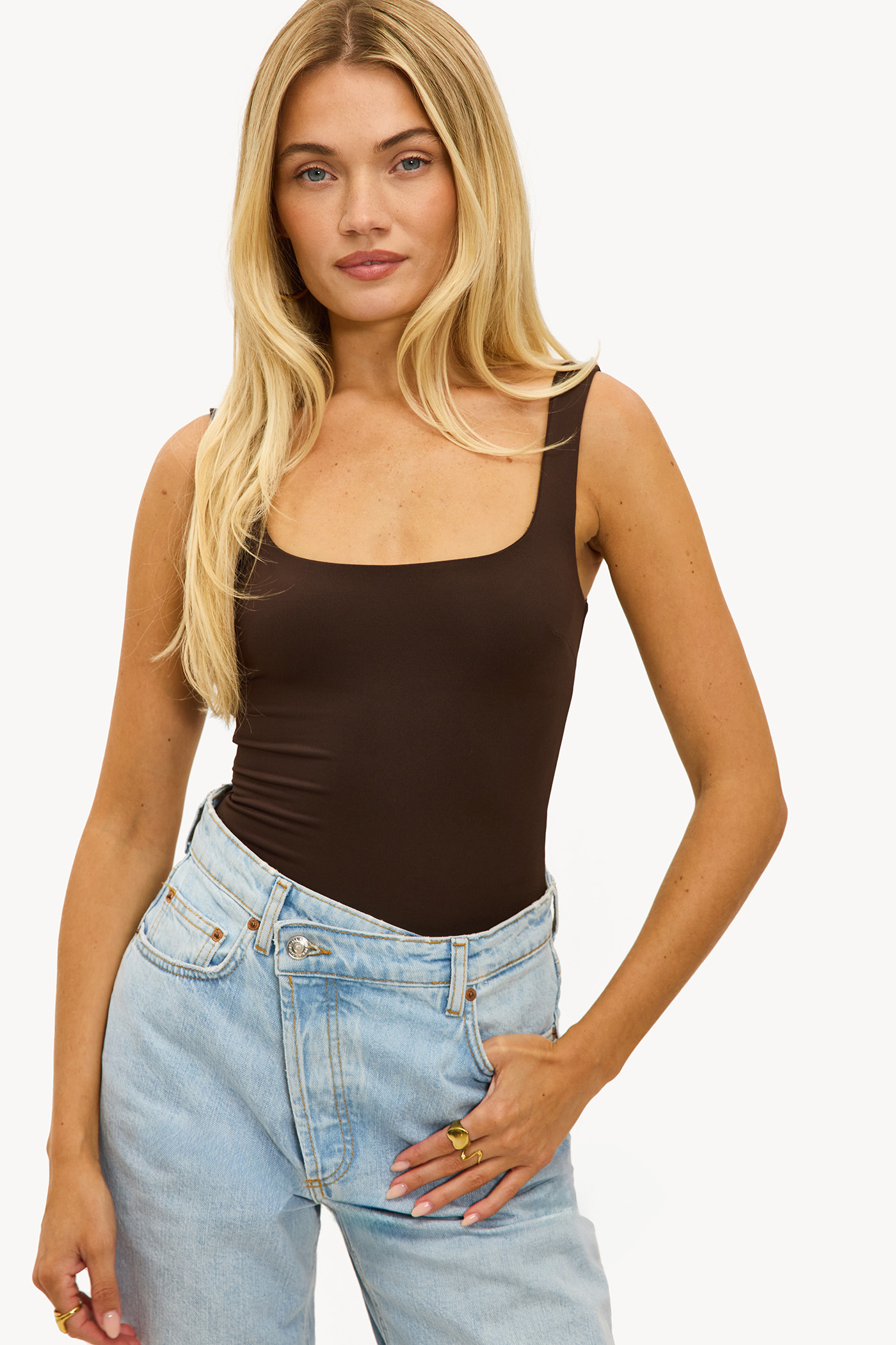 Ce body marron foncé présente une coupe moulante avec de larges bretelles pour plus de confort. L'encolure carrée et la coupe sans manches créent un look propre et minimaliste. La qualité stretch assure un ajustement parfait qui accentue magnifiquement la silhouette. Associez ce body basique avec un jean taille haute pour un look chic sans effort.