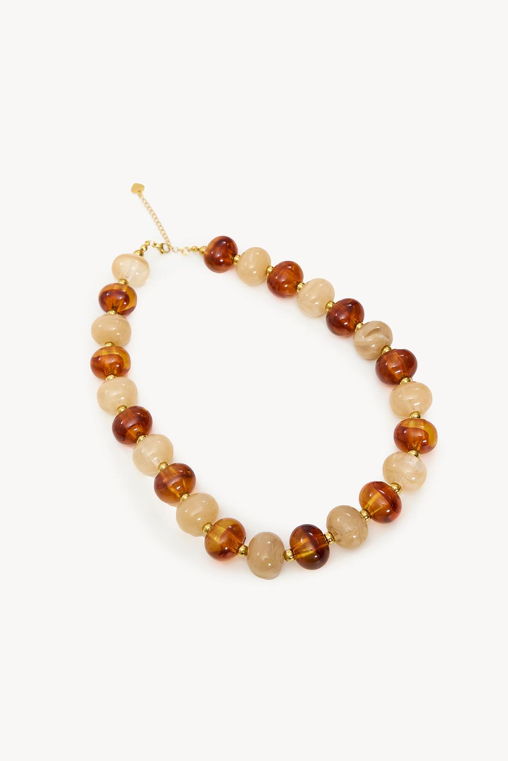 Ce collier statement présente des perles brillantes dans des tons bruns chauds pour un look luxueux. Le motif alterné de perles sombres et claires crée un look sophistiqué. La fermeture réglable assure un ajustement parfait. Associez ce collier avec un pull basique pour une touche chic pendant votre pause déjeuner.