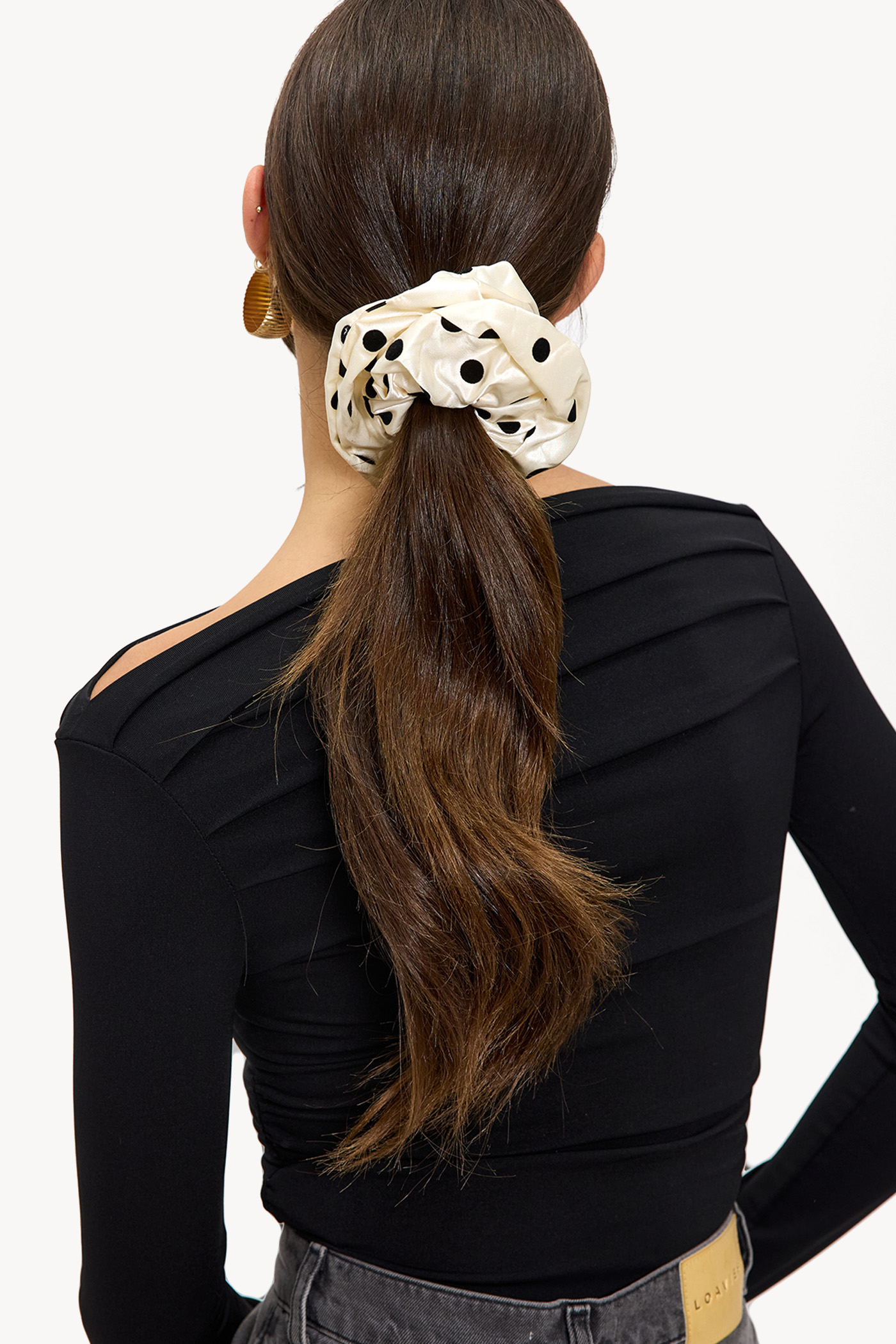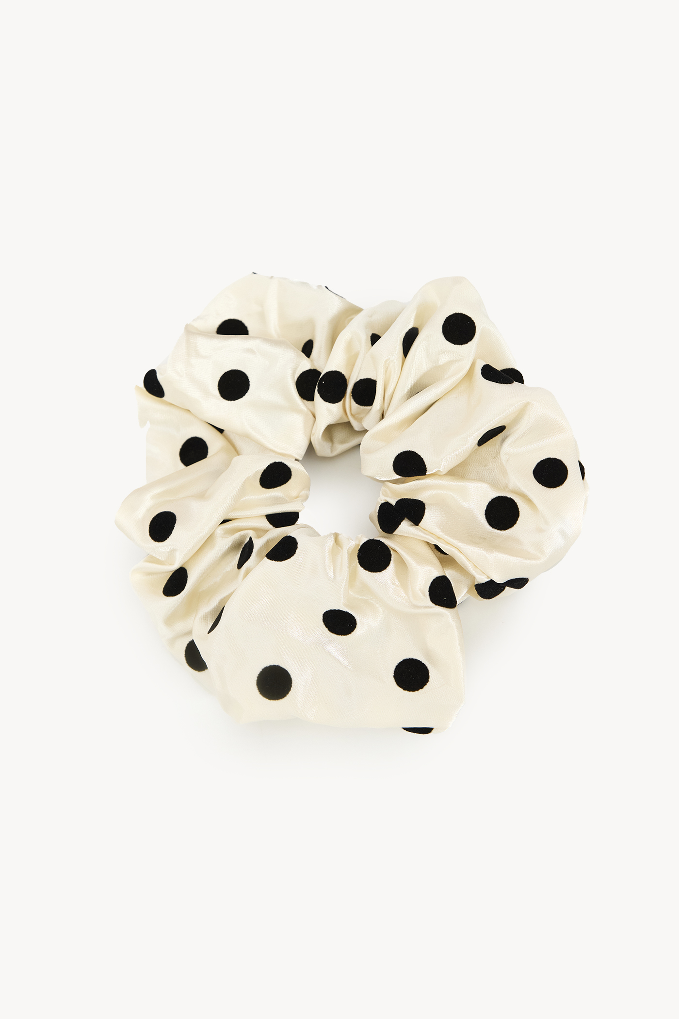 Ce chouchou blanc cassé présente un imprimé à pois intemporel avec des points noirs pour un look classique. La qualité douce du polyester assure le confort et maintient vos cheveux fermement sans les abîmer. Parfait pour les looks quotidiens décontractés et les coiffures chics.