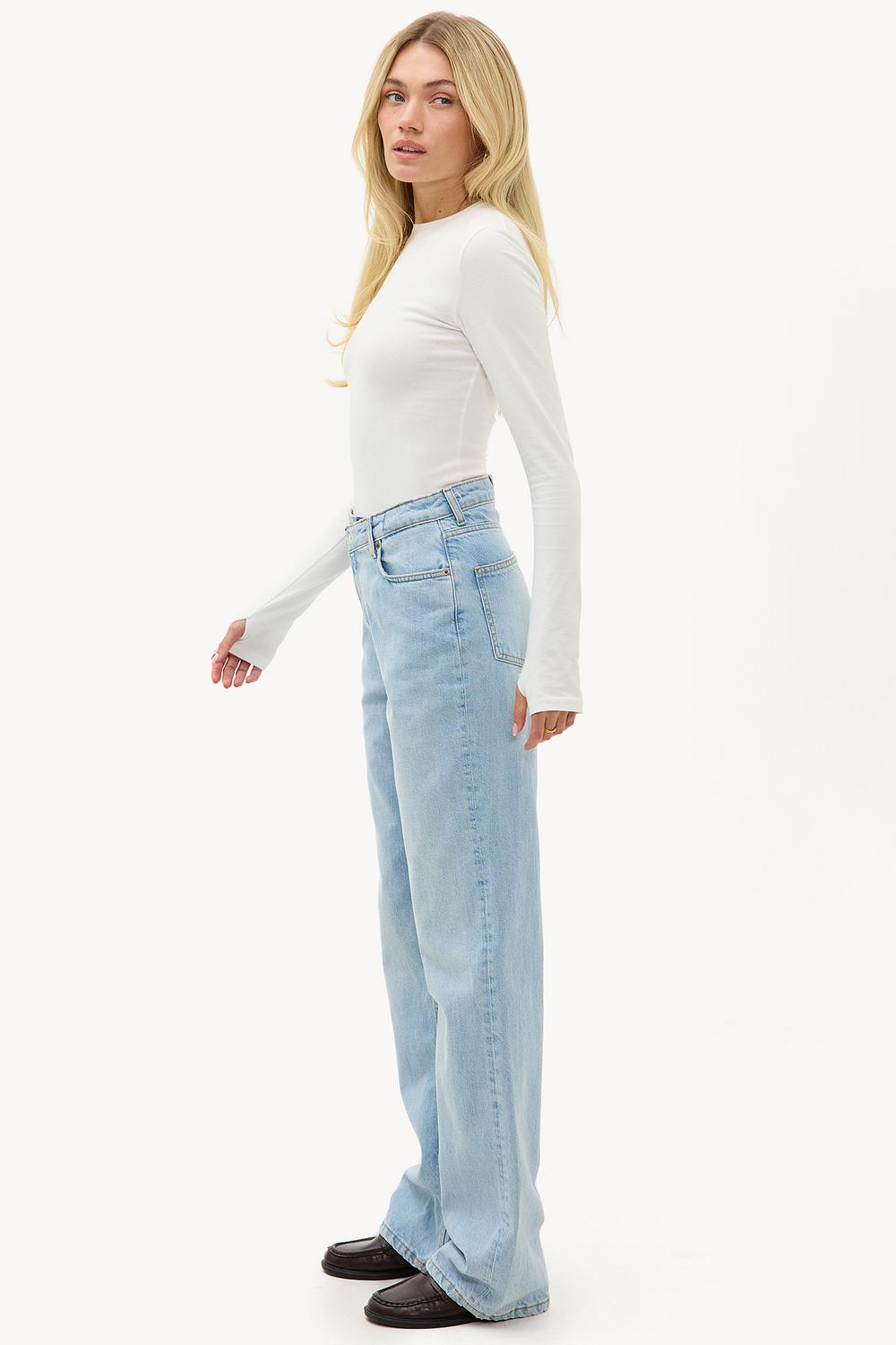 Ce jean droit à 5 poches présente un délavage bleu clair pour un look denim frais. La coupe taille haute avec des jambes larges et droites crée une apparence détendue mais chic. La fermeture classique à boutons et les coutures contrastées donnent à ce jean une ambiance denim authentique. Associez ce jean à un blazer oversize pour un look de bureau moderne.