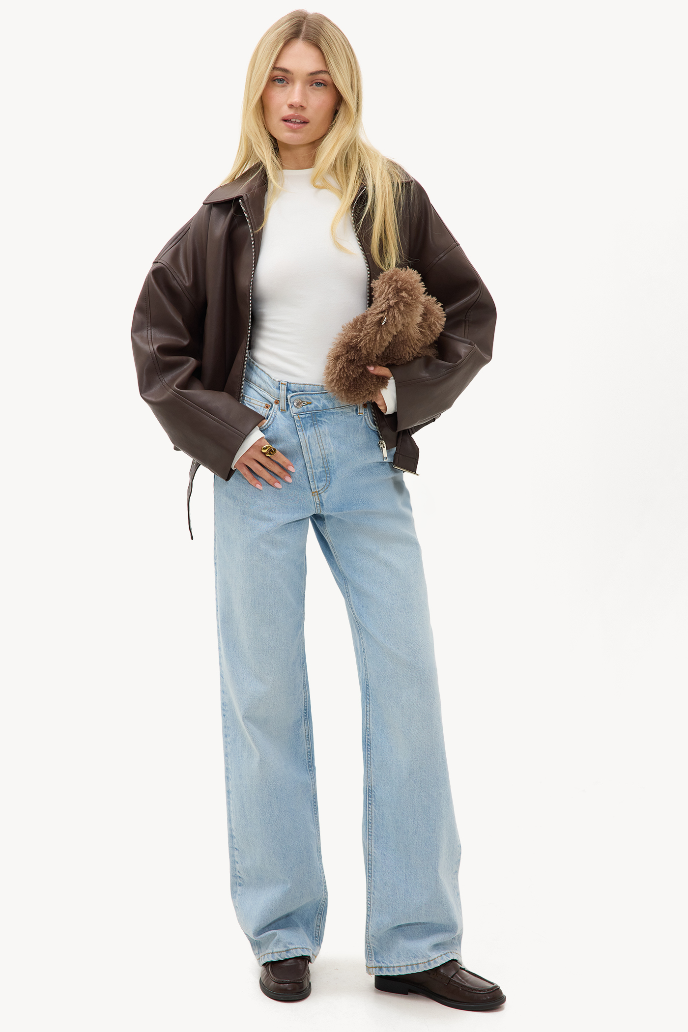 Jeans bleu clair coupe droite mi-hauteur 59,99 €Ce jean droit à 5 poches présente un délavage bleu clair pour un look denim frais. La coupe taille haute avec des jambes larges et droites crée une apparence détendue mais chic. La fermeture classique à boutons et les coutures contrastées donnent à ce jean une ambiance denim authentique. Associez ce jean à un blazer oversize pour un look de bureau moderne.