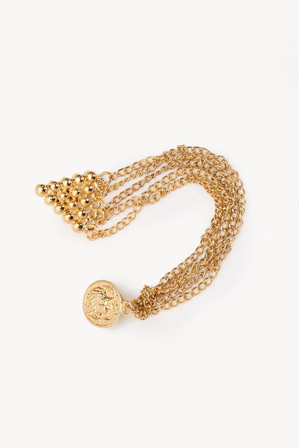 Cette chaîne de blazer dorée présente un design luxueux avec des détails texturés saisissants aux deux extrémités. Le collier à plusieurs couches de chaînes crée un look sophistiqué. Cet accessoire, fabriqué en acier inoxydable plaqué or à 100%, offre une mise à niveau chic à tout blazer ou veste.