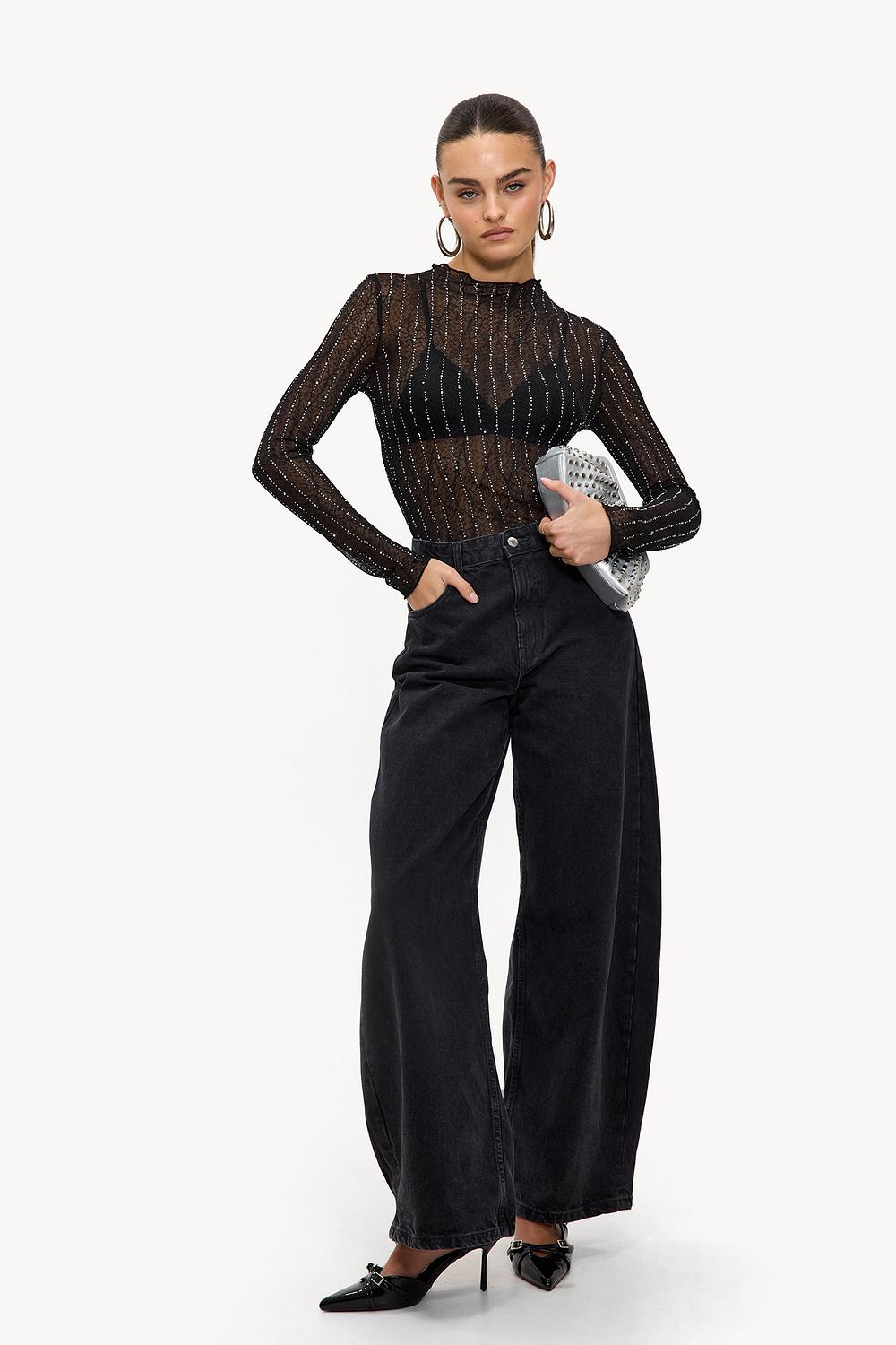 Ce haut à manches longues noir présente un design en mesh transparent avec des clous brillants partout pour un look affirmé. Le col montant et la coupe moulante créent une apparence chic avec une touche audacieuse. Les manches longues avec une légère élasticité assurent confort et liberté de mouvement. Associez ce haut à un jean taille haute pour une soirée entre filles.