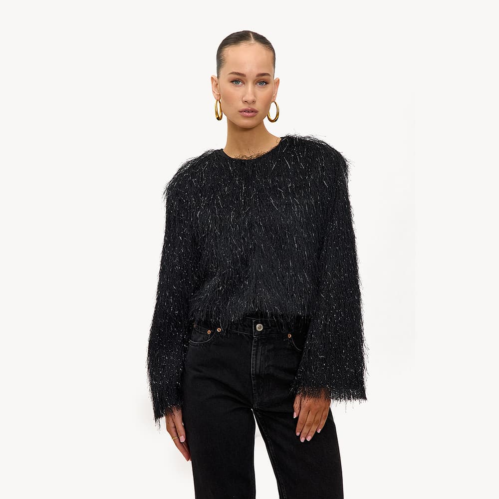 Cardigan noir avec fil lurex 59,99 €Ce cardigan noir présente une texture en fausse fourrure luxueuse qui fait immédiatement sensation. La coupe courte avec des manches longues crée un contraste chic avec les détails duveteux. Le devant ouvert sans fermeture donne à ce cardigan une touche moderne. Associez cette pièce maîtresse avec un haut noir et un jean à jambes larges pour un look sophistiqué.