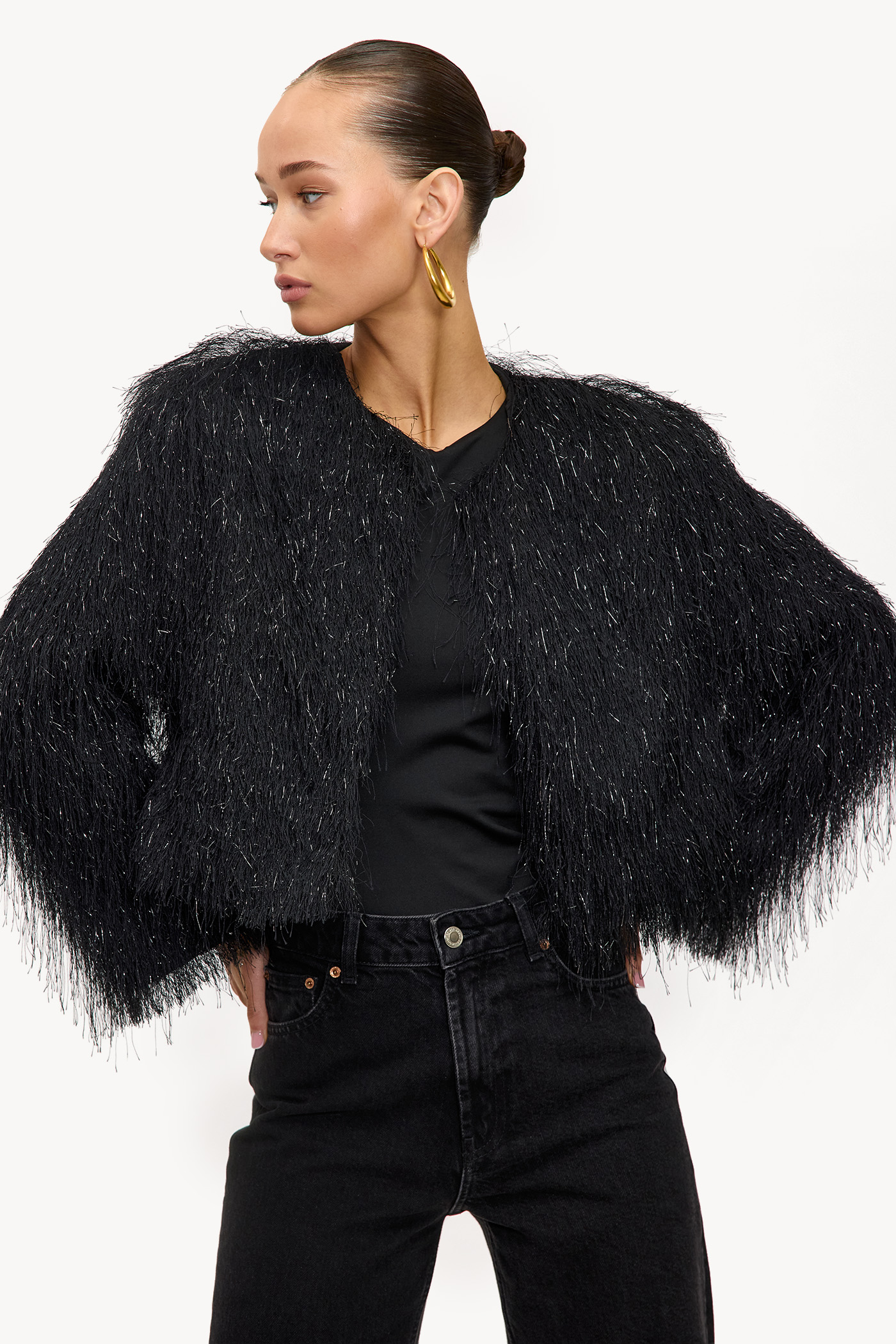Ce cardigan noir présente une texture en fausse fourrure luxueuse qui fait immédiatement sensation. La coupe courte avec des manches longues crée un contraste chic avec les détails duveteux. Le devant ouvert sans fermeture donne à ce cardigan une touche moderne. Associez cette pièce maîtresse avec un haut noir et un jean à jambes larges pour un look sophistiqué.