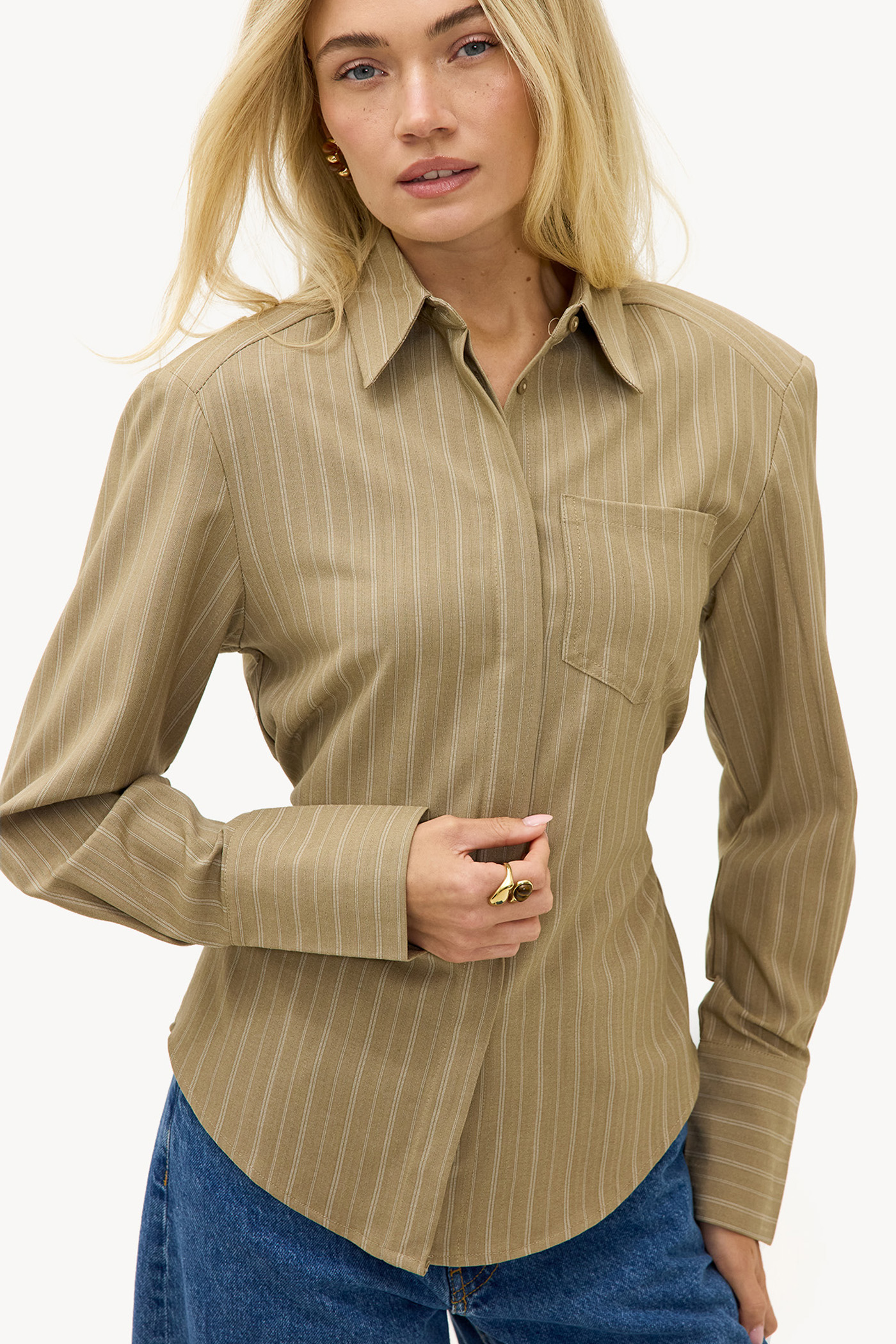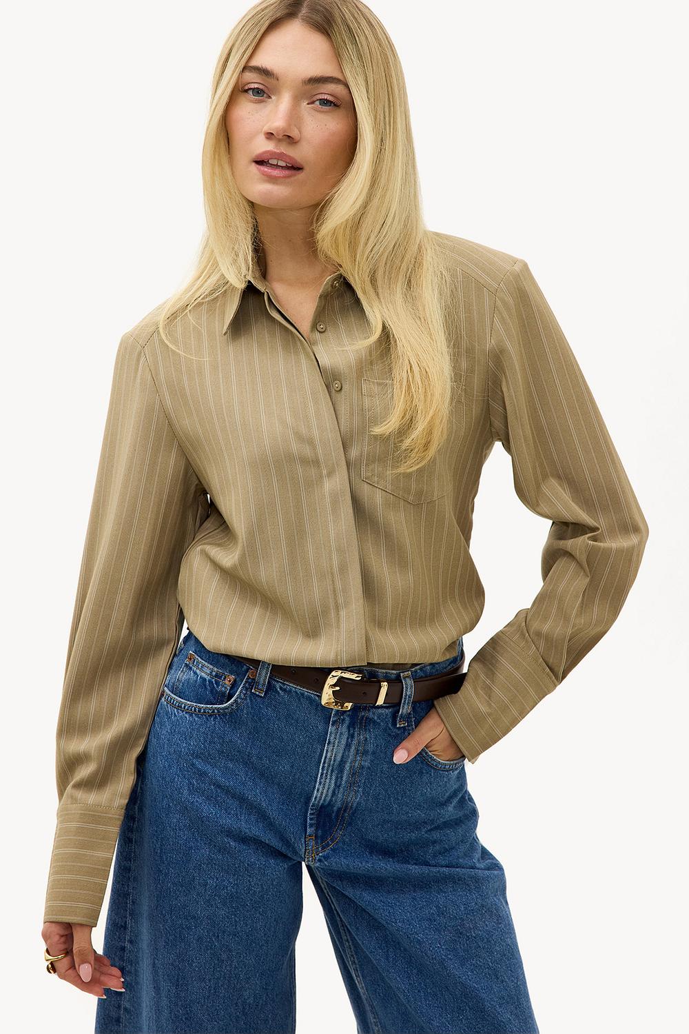 Chemisier rayé vert clair avec épaulettes et détail nœud 49,99 €Cette blouse camel présente un imprimé à rayures classiques avec une coupe ajustée. La fermeture à boutons et la poche poitrine offrent un look de bureau chic, tandis que l'étirement subtil assure le confort. La coupe ajustée et les épaulettes accentuent la silhouette de manière élégante. Associez cette blouse à un jean large pour un look décontracté et soigné.