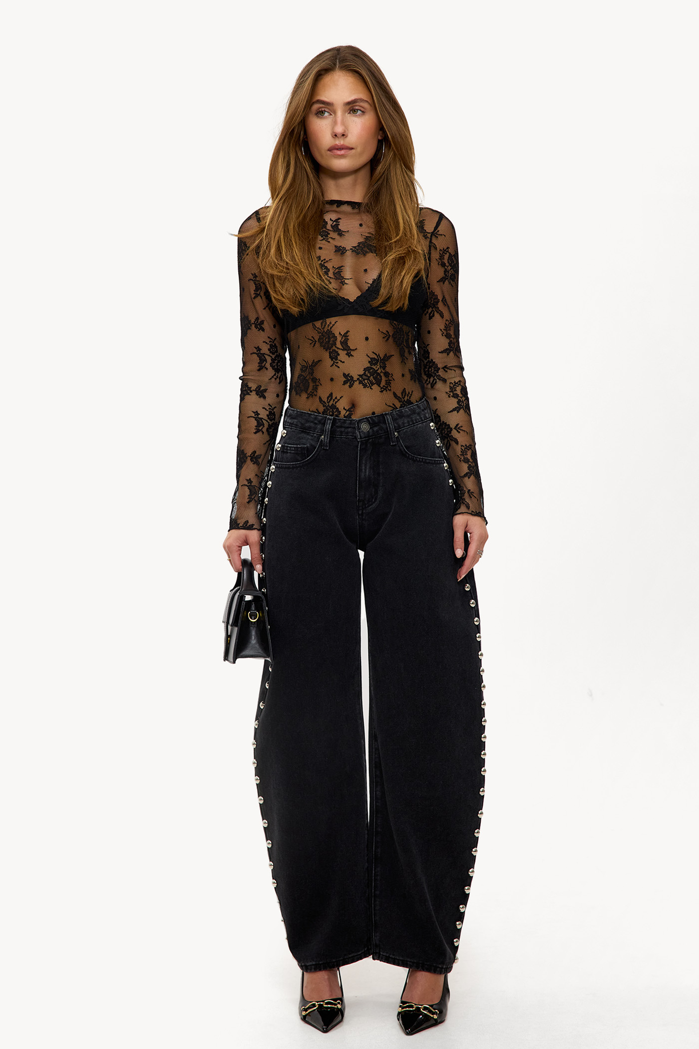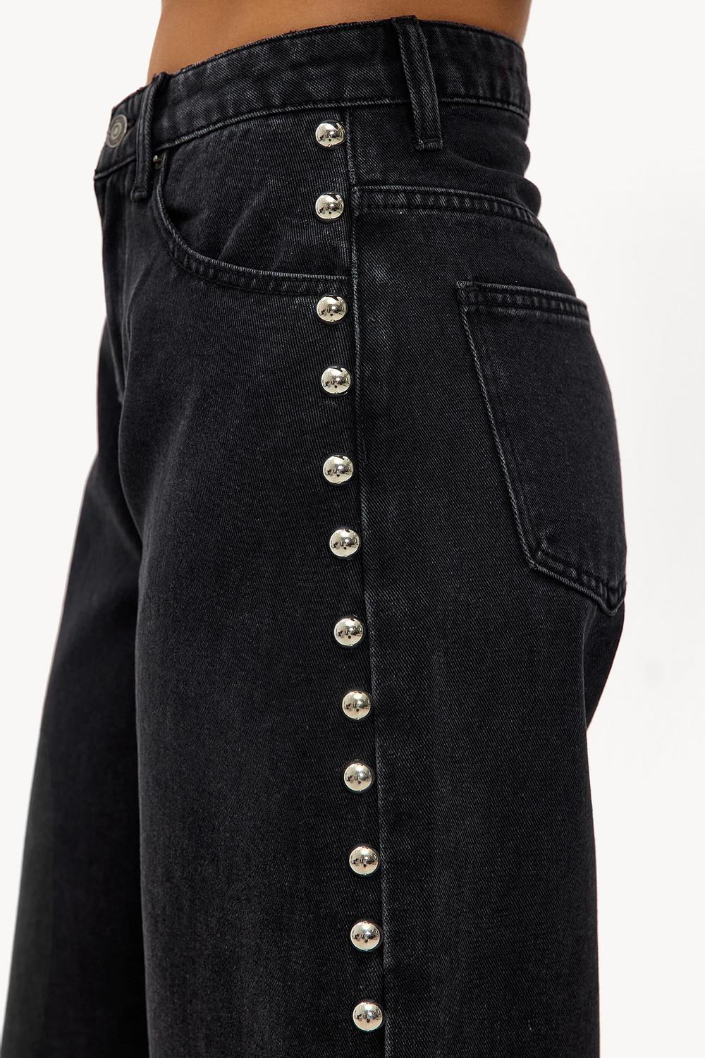 Jean ballon gris foncé avec clous argentés 69,99 €Ce jean noir à jambes larges présente des clous frappants sur toutes les coutures latérales pour un look audacieux. Le lavage vintage et la coupe taille haute donnent à ce pantalon en denim une allure rock-chic. Les jambes larges créent une touche moderne au design classique du jean. Associez ce jean avec un haut transparent et des talons pointus pour un look iconique de soirée entre filles.