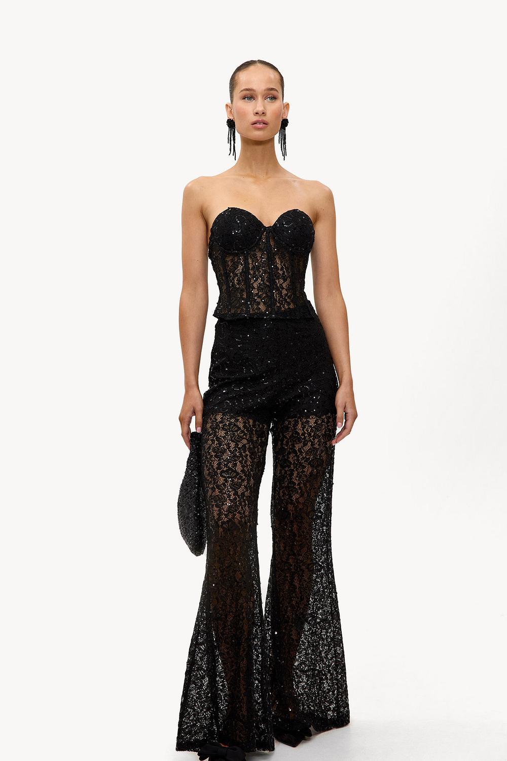 Ce corset noir présente un design en dentelle luxueux avec des détails de sequins subtils partout. La coupe sans bretelles avec encolure en cœur et panneaux de dentelle transparents crée un look affirmé. La coupe ajustée accentue élégamment la silhouette. Associez ce corset avec un pantalon large pour un look de fête chic.