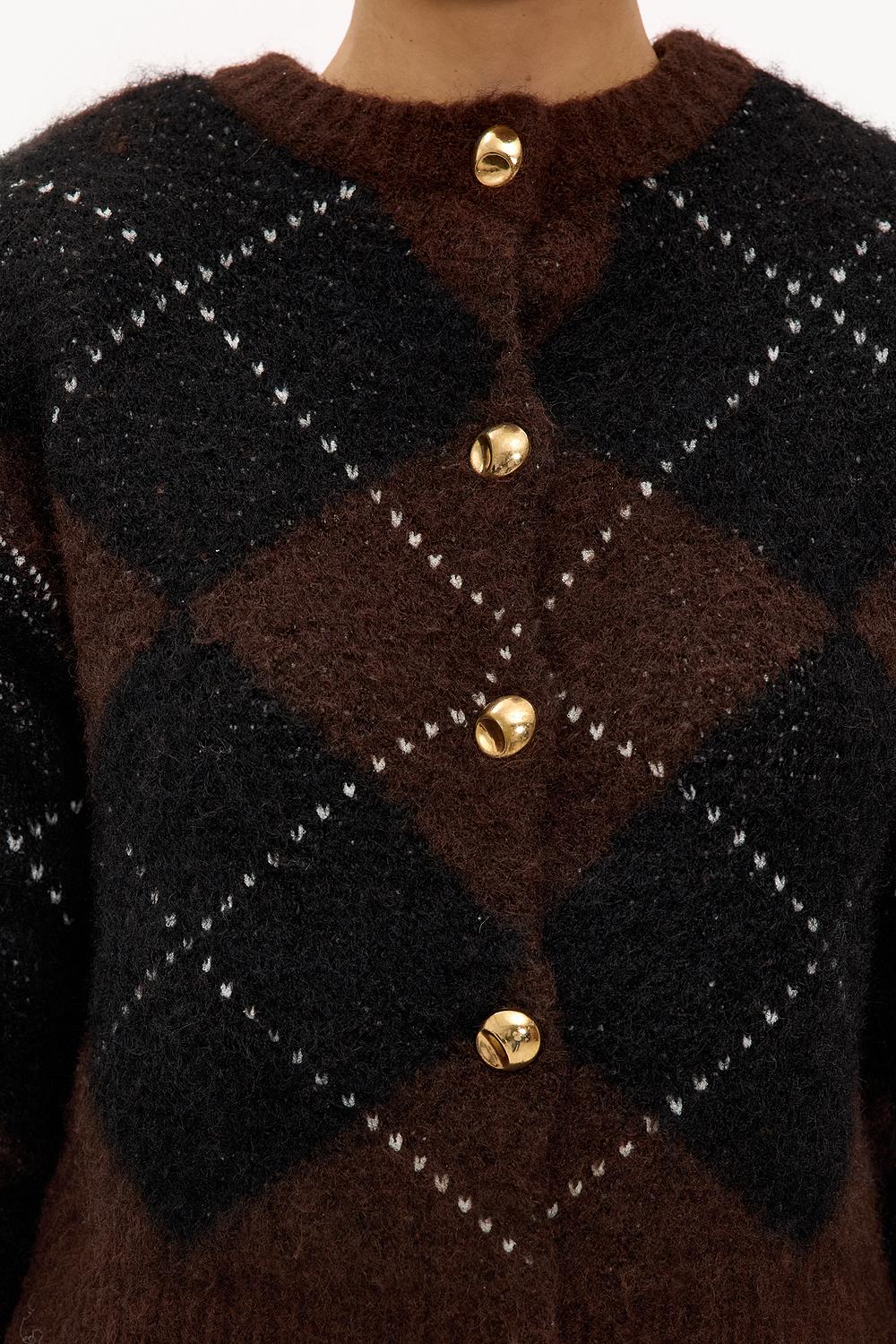Ce cardigan en maille marron présente un motif argyle saisissant en noir et marron avec des coutures blanches contrastantes. Les boutons dorés et la coupe décontractée donnent à cet article une touche luxueuse. La coupe courte et les épaulettes créent une silhouette moderne qui se marie parfaitement avec des pantalons taille haute. Associez ce cardigan avec un pantalon effet cuir pour un look chic et contrasté.