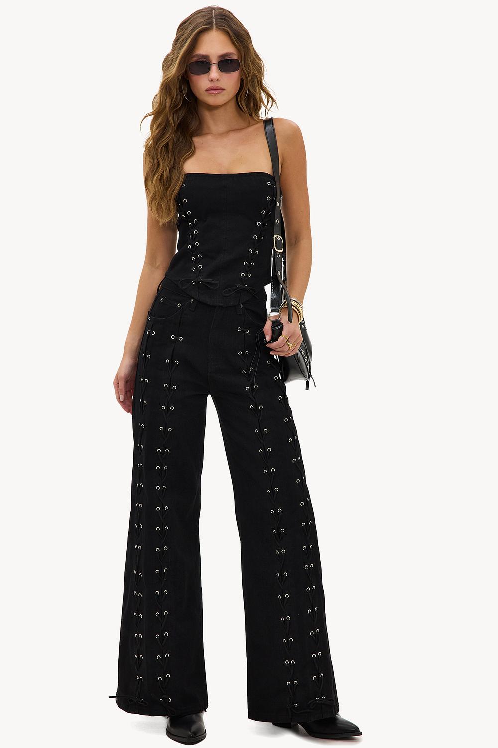 Ce jean noir à jambes larges présente des détails lacés frappants partout pour un look rock-chic audacieux. La coupe taille haute avec jambes larges crée une apparence marquante qui s'aligne parfaitement avec la tendance festival. Le mélange de denim en coton assure confort et portabilité. Associez ce jean avec le corset assorti et des bottes de cowboy pour un look festival complet.
