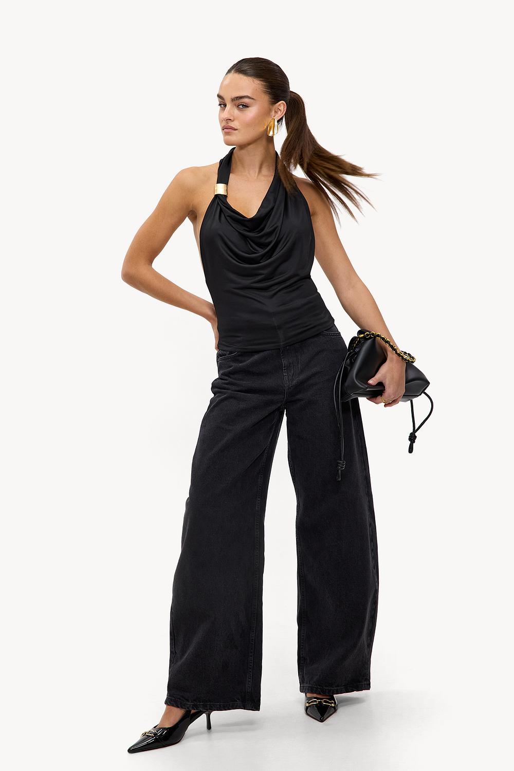 Ce haut à col halter noir présente un design drapé luxueux avec un col bénitier profond pour un look affirmé. Le dos bas et la coupe sans manches avec un détail accent doré sur la sangle halter créent une touche chic. Le mélange de polyamide extensible assure confort et ajustement parfait. Associez ce haut avec un jean à jambes larges pour un look de rendez-vous dîner.