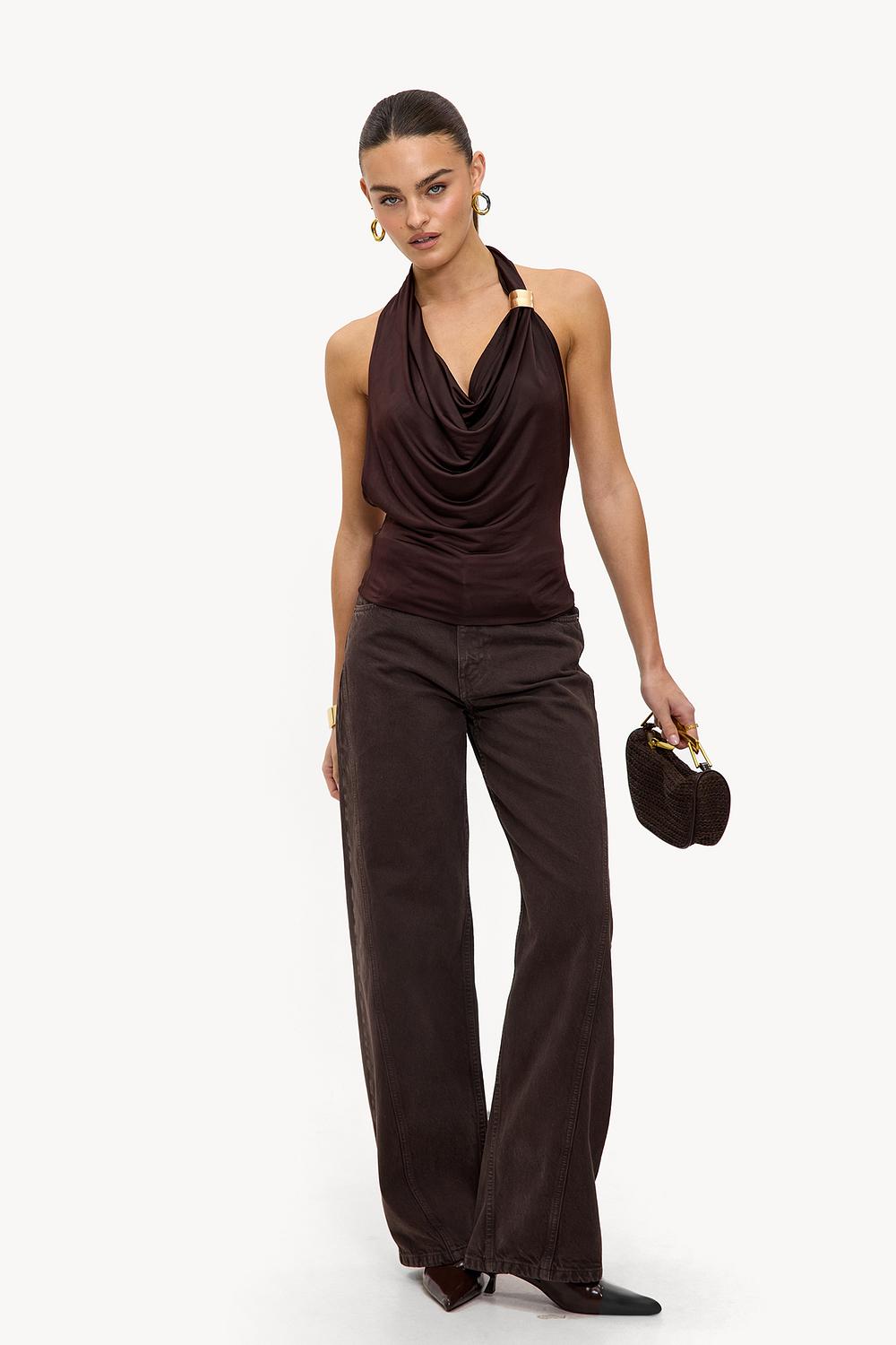 Ce haut à col licou marron foncé présente un design drapé luxueux avec un col bénitier profond pour un look sophistiqué. La coupe dos nu avec un détail accent doré sur la sangle du licou crée une apparence remarquable. La coupe moulante accentue la silhouette de manière chic. Associez ce haut avec un pantalon à jambes larges pour un look de dîner en tête-à-tête.