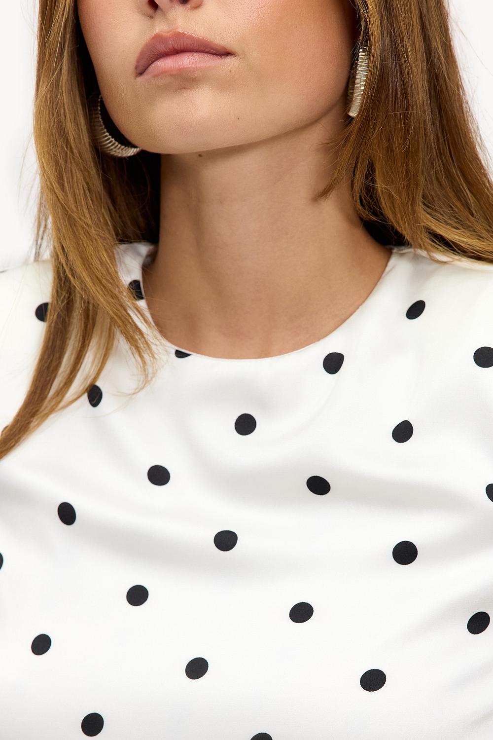 Ce haut à manches longues blanc présente un imprimé à pois classique avec des points noirs partout. La coupe décontractée avec un col rond et une fermeture à boutons à l'arrière crée un look confortable. La qualité en polyester doux assure un port fluide et un entretien facile. Associez ce haut avec un pantalon large noir pour un contraste chic.