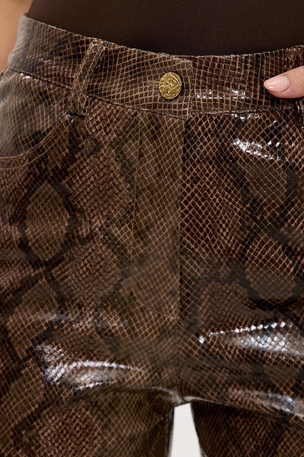 Ce pantalon droit présente un imprimé serpent saisissant en marron foncé avec une finition luxueuse effet cuir. La coupe taille haute avec jambes droites crée un look affirmé qui s'aligne parfaitement avec les tendances actuelles. Le mélange de polyuréthane assure une texture cuir authentique avec une élasticité confortable. Associez ce pantalon avec un blazer ajusté pour un look de bureau puissant.