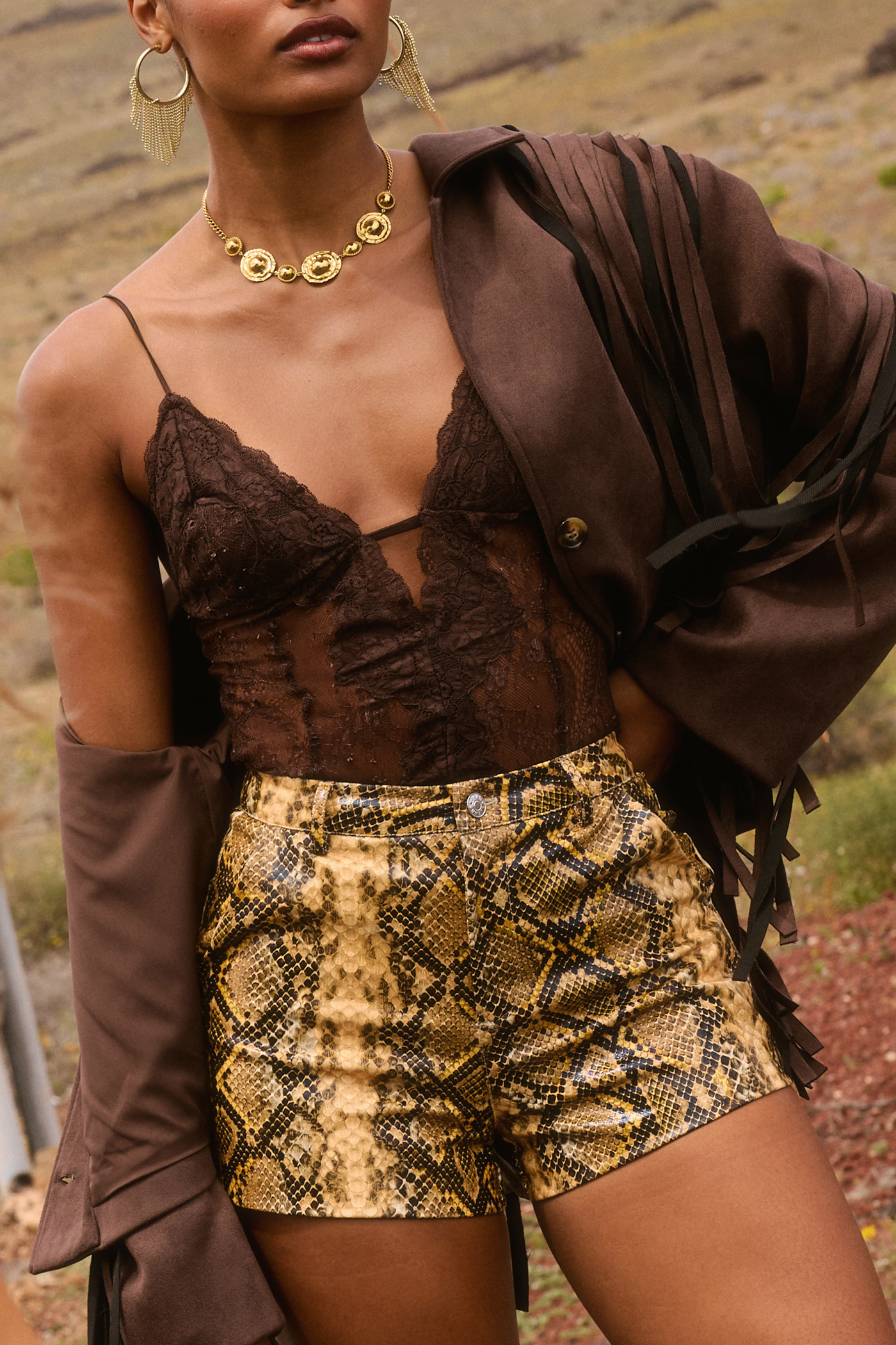 Ce short jaune présente un imprimé serpent saisissant pour un look affirmé. La coupe taille haute avec une coupe courte crée une apparence audacieuse. La finition aspect cuir vegan donne à ce short une touche luxueuse. Associez ce short à un t-shirt oversize et des bottes de cowboy pour un look prêt pour le festival.
