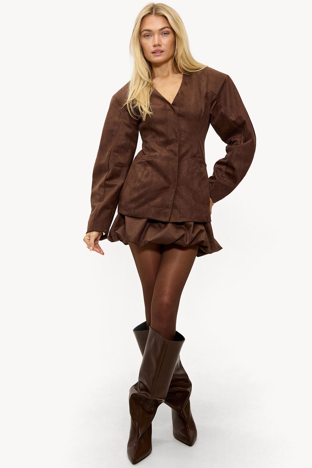 Cette mini-jupe marron foncé effet daim a une texture luxueuse et une taille élastique pour un ajustement confortable. La forme trapèze avec un volume subtil crée une apparence chic. Le mélange de polyester doux assure une liberté de mouvement et un look haut de gamme. Associez cette jupe avec un haut ajusté pour une tenue équilibrée.