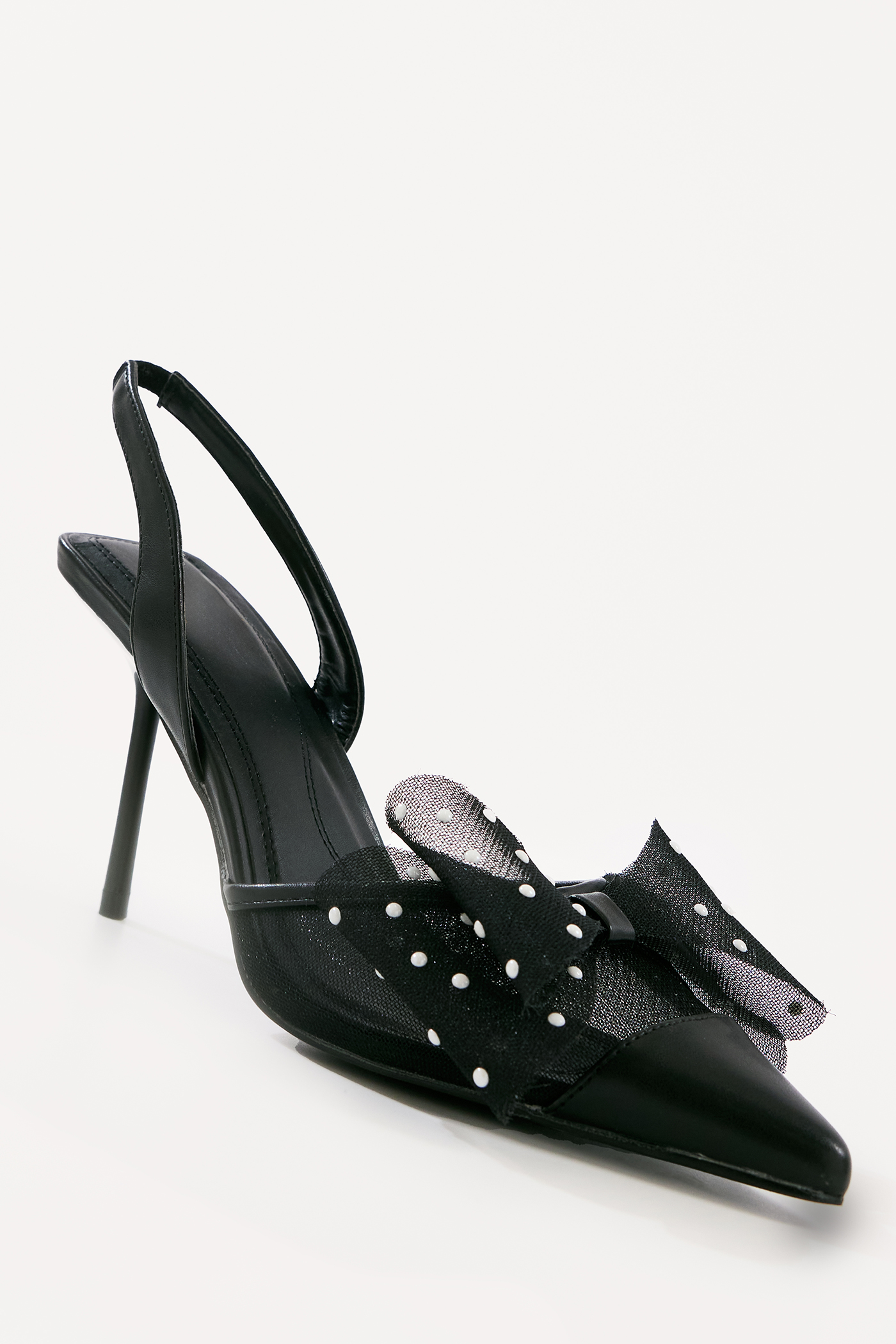Ces escarpins slingback noirs à bout pointu présentent un nœud à pois avec des pois blancs partout. Le talon haut et le design slingback créent un look chic avec une touche cool. Le bout pointu et les détails de nœud transparents donnent à ces escarpins une mise à jour moderne.
