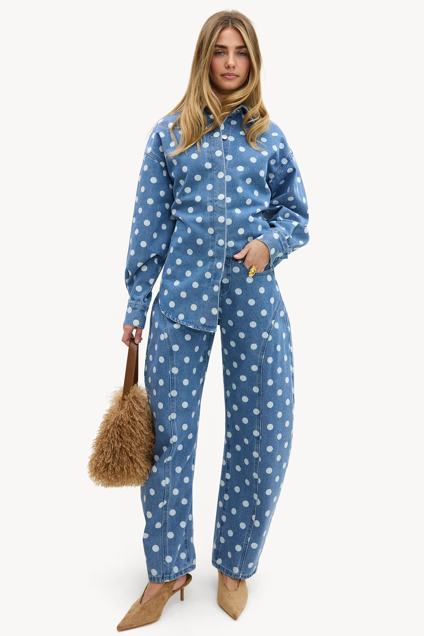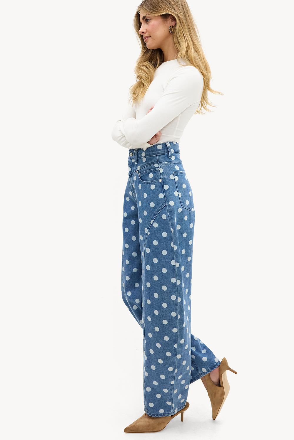Ce jean à jambes larges à 5 poches présente un imprimé à pois saisissant sur toute la surface en bleu délavé. Les jambes larges et la coupe taille haute créent une ambiance rétro cool avec une touche moderne. Le mélange de coton assure confort et durabilité. Associez ce jean statement avec un tee-shirt blanc basique ou la blouse assortie pour un look chic décontracté.
