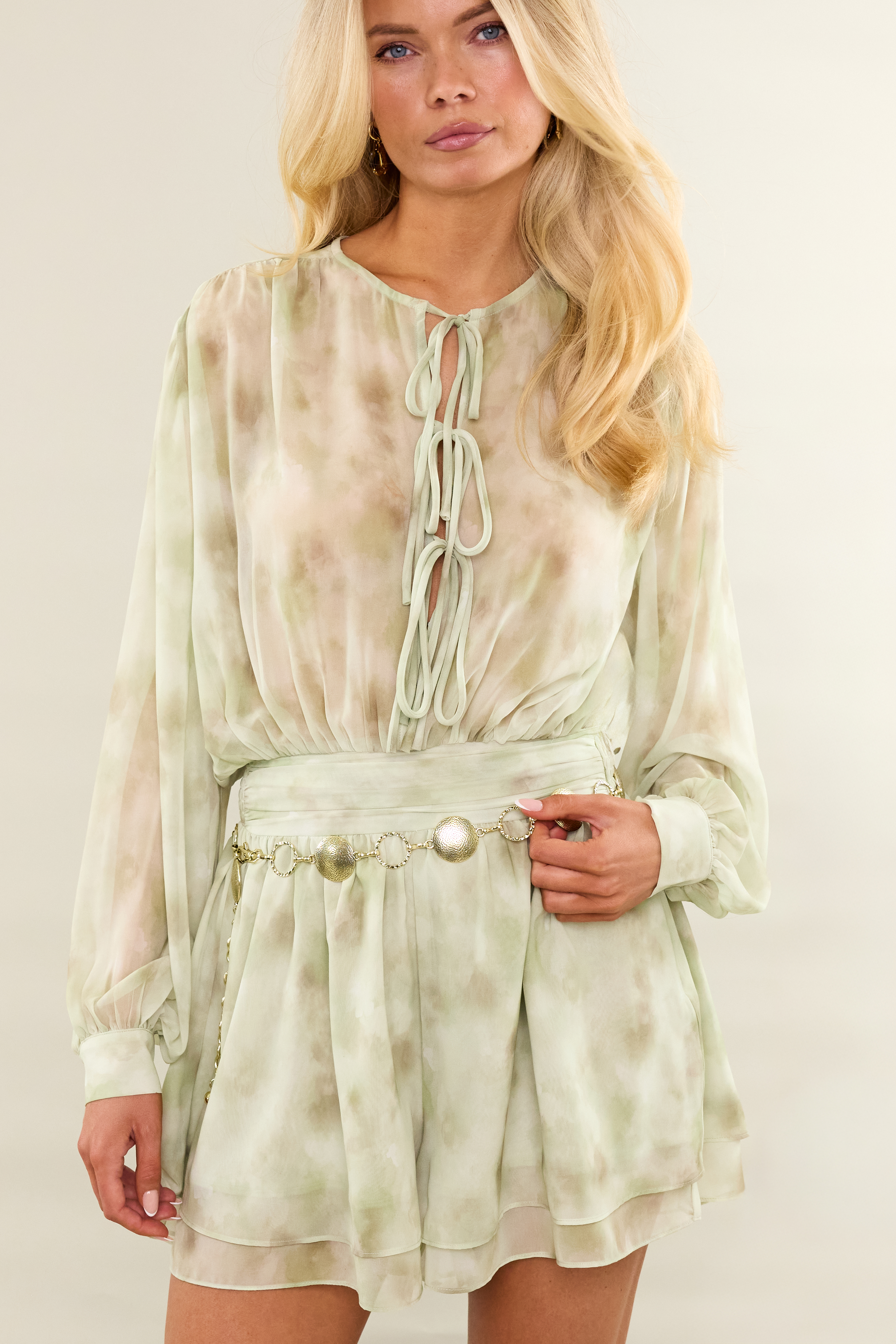 Cette combinaison vert clair présente un imprimé tie-dye subtil avec des manches ballon pour un look bohème. Le détail lacé à l'avant et la ceinture élastique créent une coupe flatteuse. Les shorts courts avec des détails plissés donnent à cette combinaison une touche moderne. Associez cette combinaison avec des bottes de cowboy pour un look prêt pour le festival.