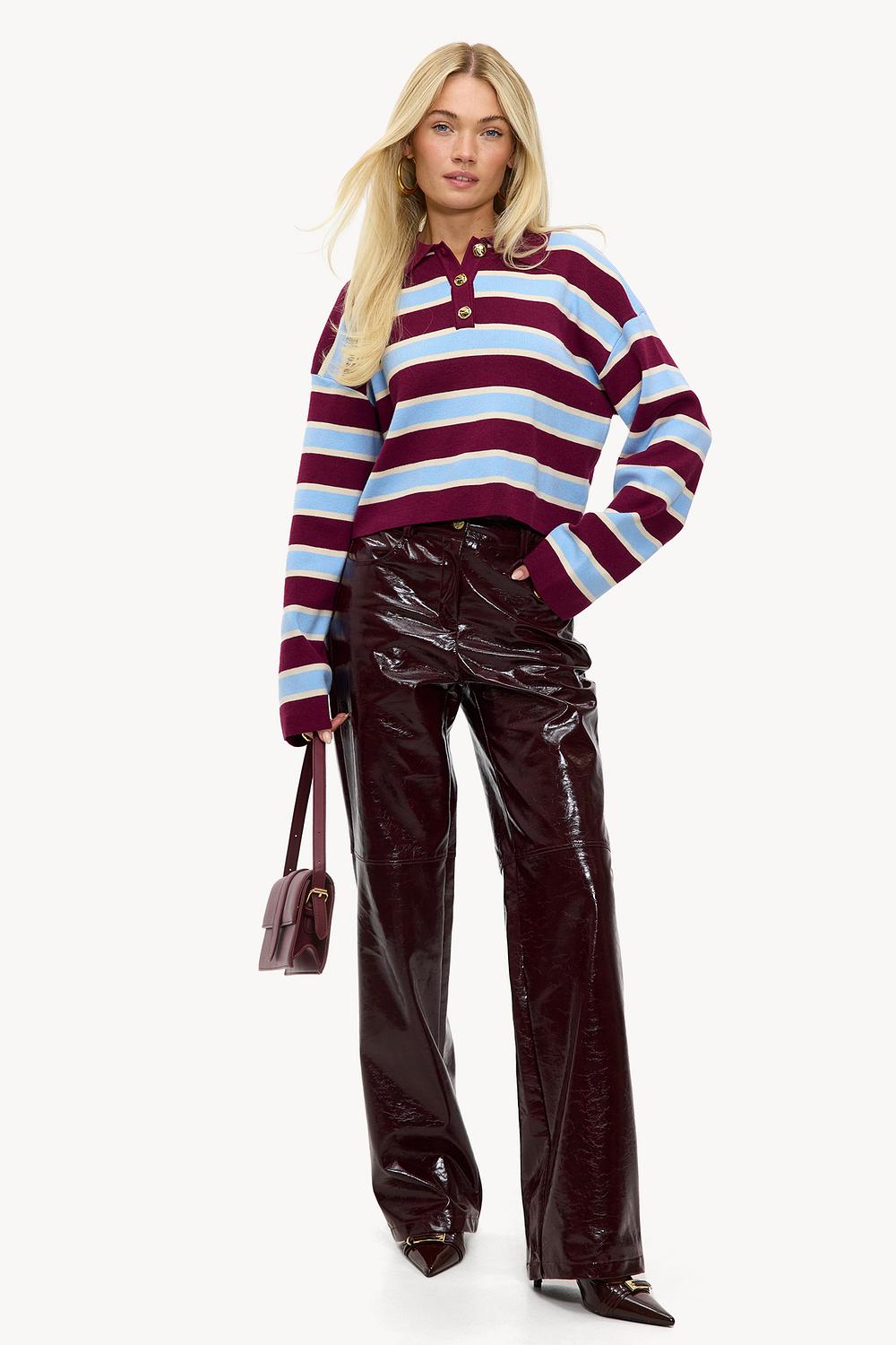Polo bordeaux à rayures 49,99 €Ce polo à manches longues à rayures bordeaux a un design inspiré du rétro avec des rayures contrastées bleu clair et blanches. La coupe courte avec col polo classique et boutons dorés donne une touche preppy à votre look. La coupe oversize assure confort et apparence décontractée. Associez ce haut avec un pantalon en similicuir taille haute pour une ambiance vintage cool.
