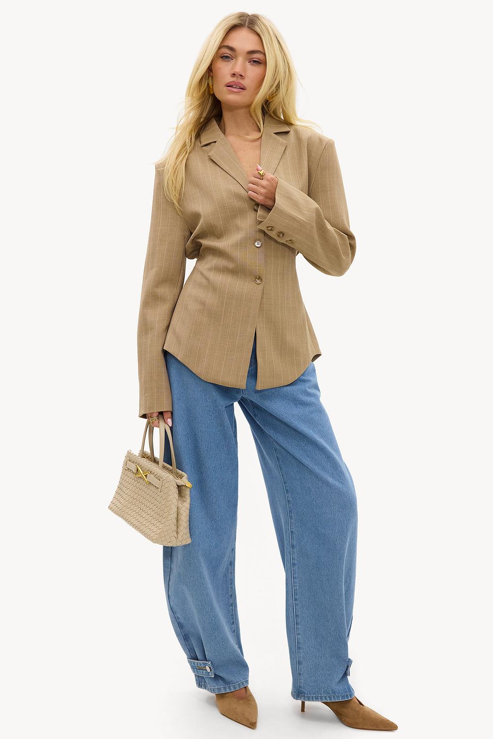 Blazer rayé beige avec épaulettes et ceinture à nouer 59,99 €Ce blazer camel présente un motif à rayures classiques avec des boutons dorés en relief. La coupe ajustée et l'ourlet asymétrique créent un look actualisé. Le mélange de polyester doux assure confort et apparence luxueuse. Associez ce blazer avec un jean large pour un look business casual chic.
