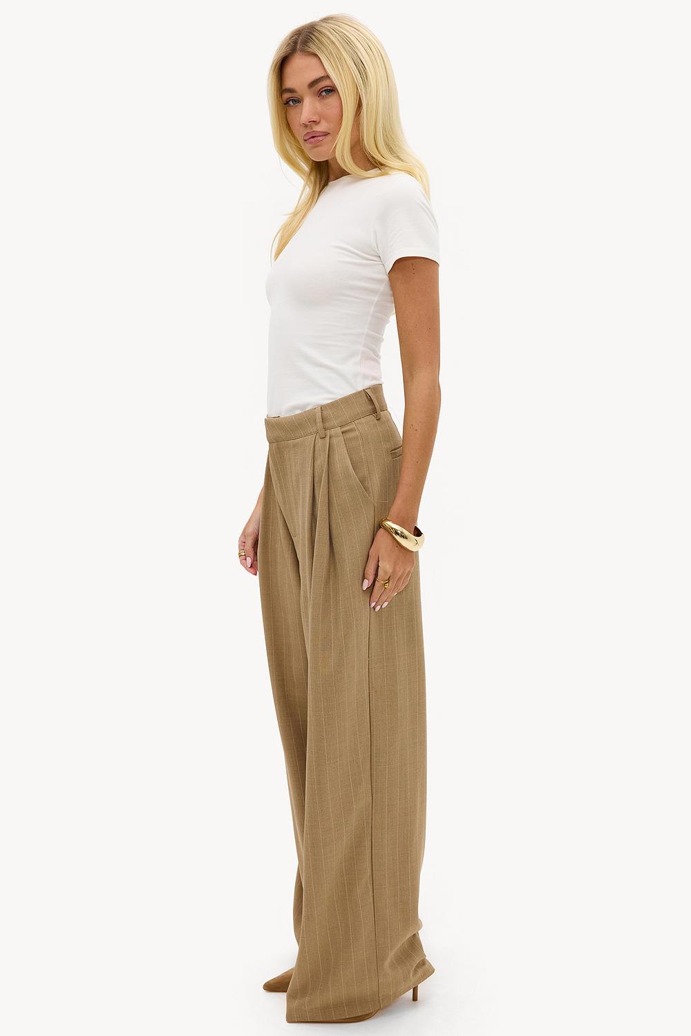 Ce pantalon camel à jambes larges présente un motif à rayures chic pour un look sur mesure. La coupe taille haute avec des plis à l'avant et des jambes larges crée une apparence sophistiquée. Le mélange de polyester doux assure confort et sensation luxueuse. Associez ce pantalon avec le blazer assorti pour un look coordonné puissant lors des journées au bureau.