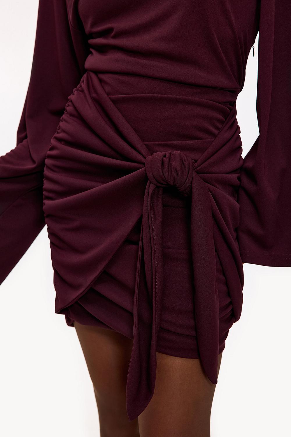 Cette mini-robe bordeaux présente un design drapé saisissant avec un détail nœud sur le côté. Les manches larges et la coupe moulante créent un look chic avec une touche moderne. L'effet portefeuille avec un ourlet asymétrique donne à cette robe une apparence luxueuse. Associez cette robe avec des escarpins à bout pointu pour un look de dîner en tête-à-tête.