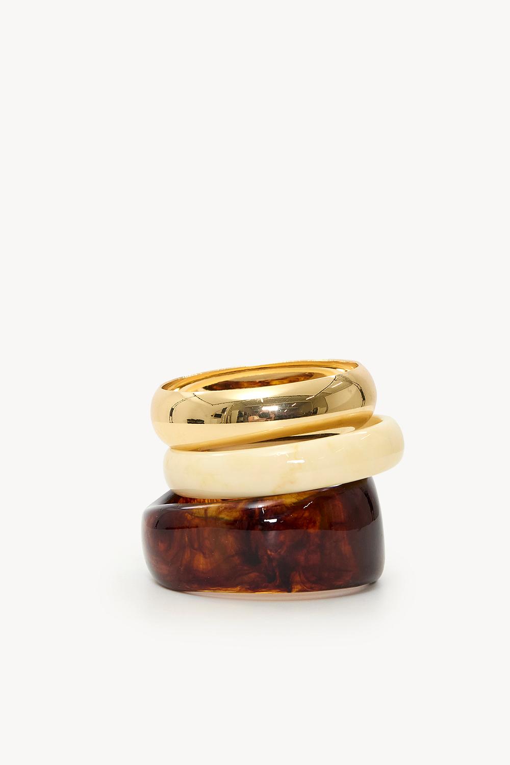 Lot de 3 bracelets 24,99 €Cet ensemble de bracelets statement combine des bracelets métalliques dorés avec un accent écaille de tortue pour un look luxueux. Le mélange de différentes textures et nuances crée une combinaison de bracelets sophistiquée. Les différentes largeurs ajoutent de la profondeur à votre style et rendent cet ensemble parfait pour le superposition.