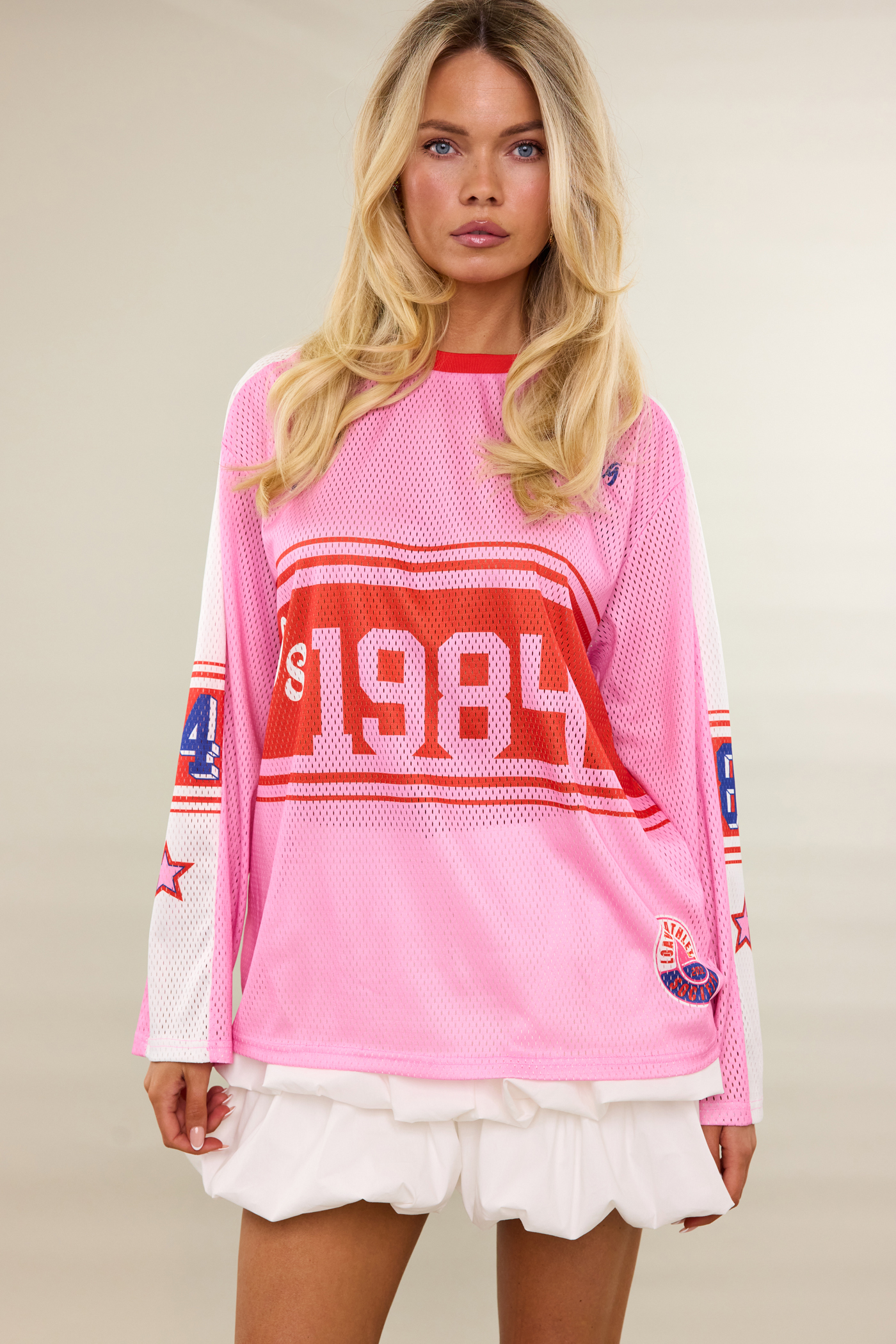 Ce haut à manches longues rose présente une impression '1984' frappante avec une texture en mesh pour un look sportif rétro. La coupe oversize avec des accents rouges contrastants et des patchs sur les manches crée une ambiance vintage cool. Associez ce haut avec une mini-jupe blanche et des baskets épaisses pour un look décontracté en ville.