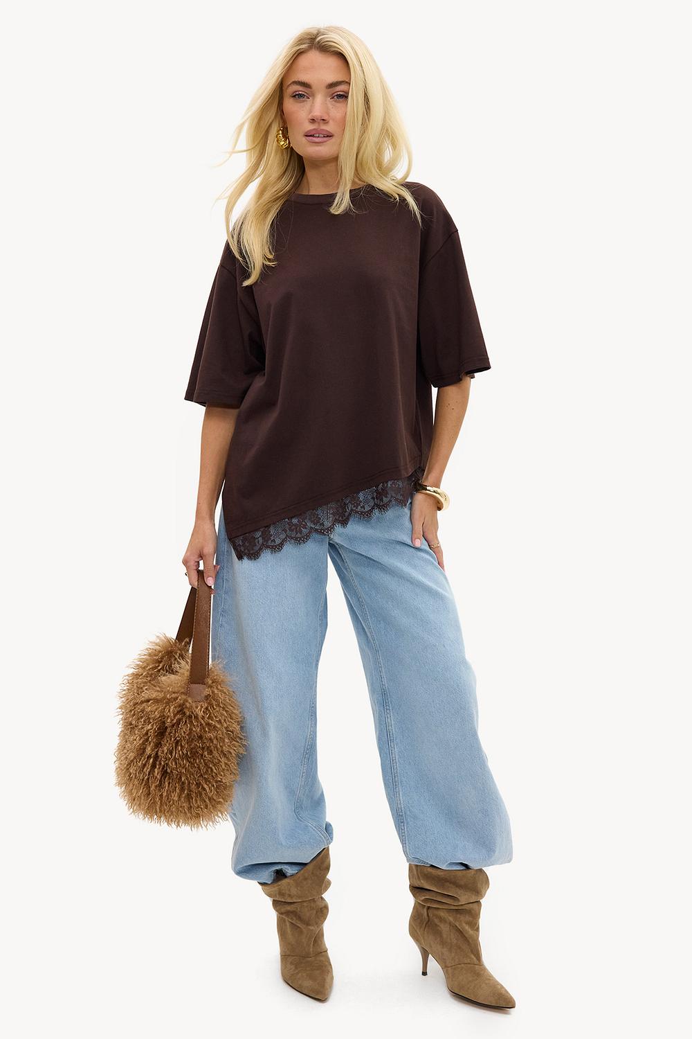 Ce T-shirt oversize marron foncé présente un détail en dentelle à la base pour une touche féminine. La coupe décontractée avec des manches courtes crée un look décontracté et cool. La qualité 100% coton assure confort et apparence luxueuse. Associez ce T-shirt avec un jean à jambes larges et des bottes de cowboy pour un look chic sans effort.