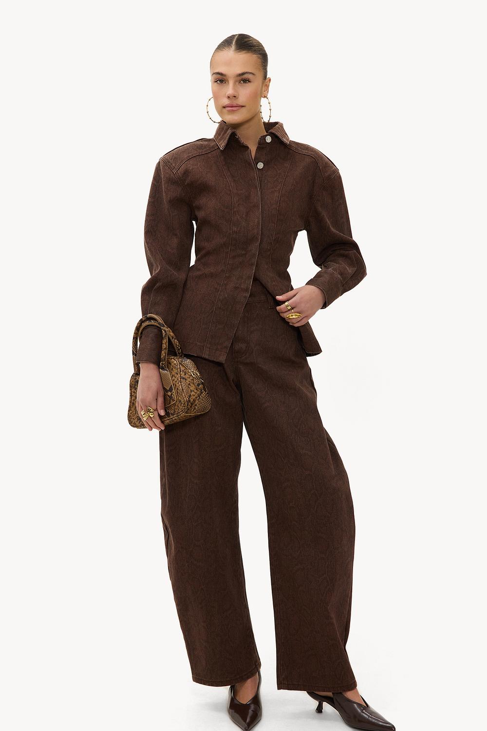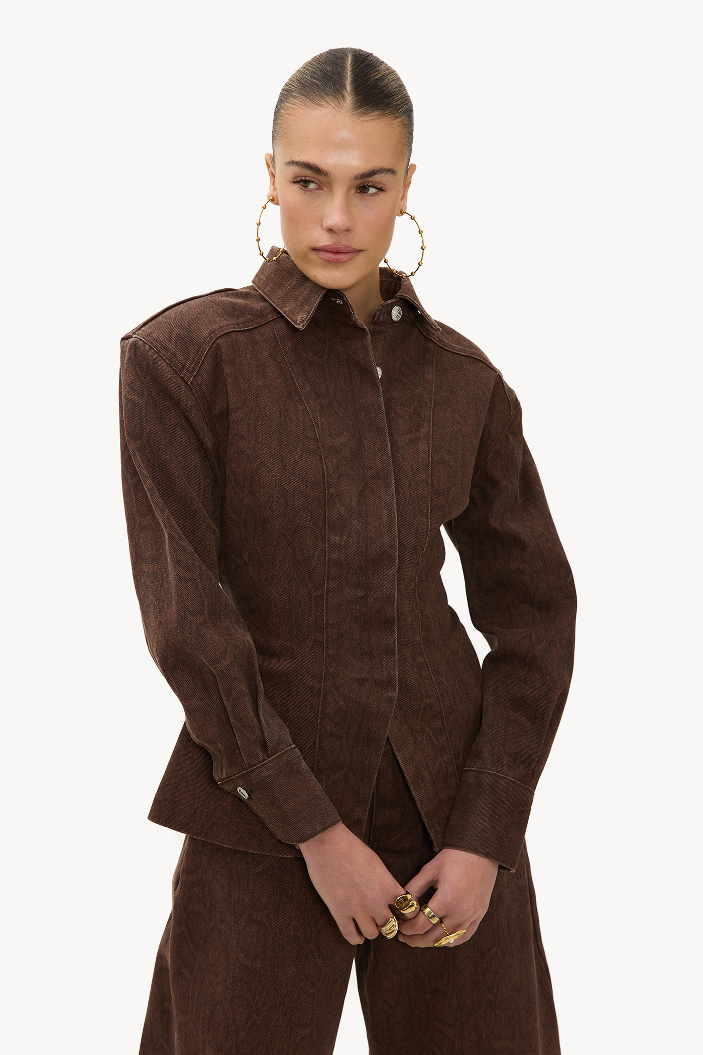 Cette blouse boutonnée marron présente un imprimé serpent luxueux pour un look affirmé. La coupe ajustée avec un col classique et une fermeture à boutons crée une apparence chic. Les manches longues avec poignets ajoutent une touche professionnelle. Associez cette blouse avec le jean ballon assorti pour un look coordonné sophistiqué.