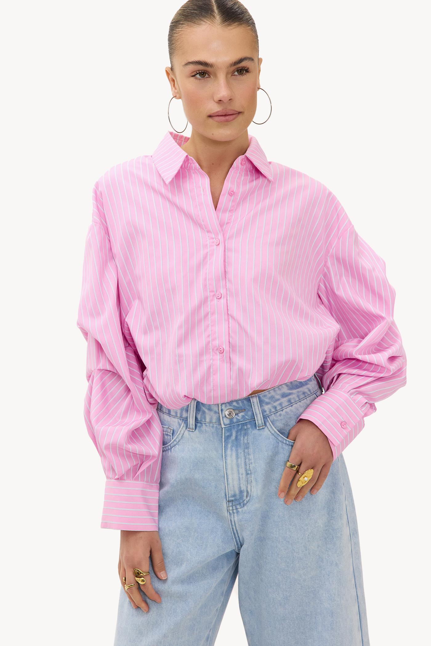 Cette blouse rose à boutons présente un motif à fines rayures classique pour un look intemporel. La coupe oversize avec fermeture à boutons et col classique crée une apparence chic et décontractée. Les manches longues avec poignets donnent à cette blouse une touche soignée. Associez cette blouse avec un jean à jambes larges pour un look de bureau sans effort.
