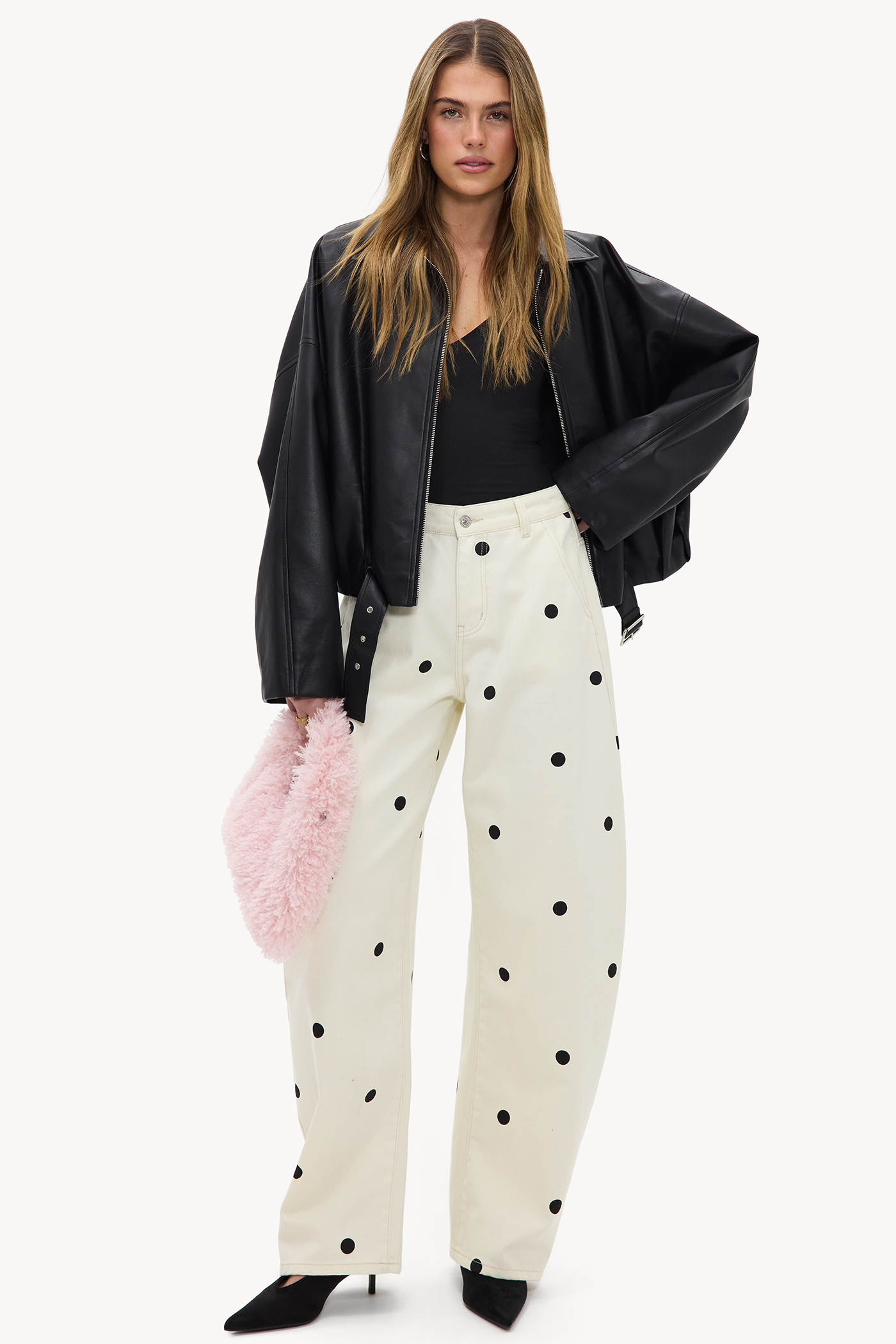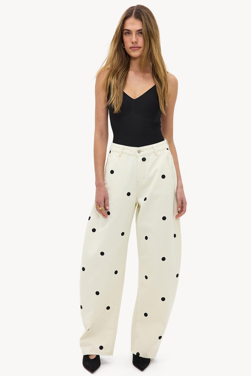 Ce jean évasé écru présente un imprimé à pois audacieux pour un look affirmé. La coupe taille haute avec jambes larges crée une touche moderne sur le design classique en denim. La qualité du coton assure confort et apparence luxueuse. Associez ce jean avec un haut noir et un blazer oversize pour un look chic et décontracté.
