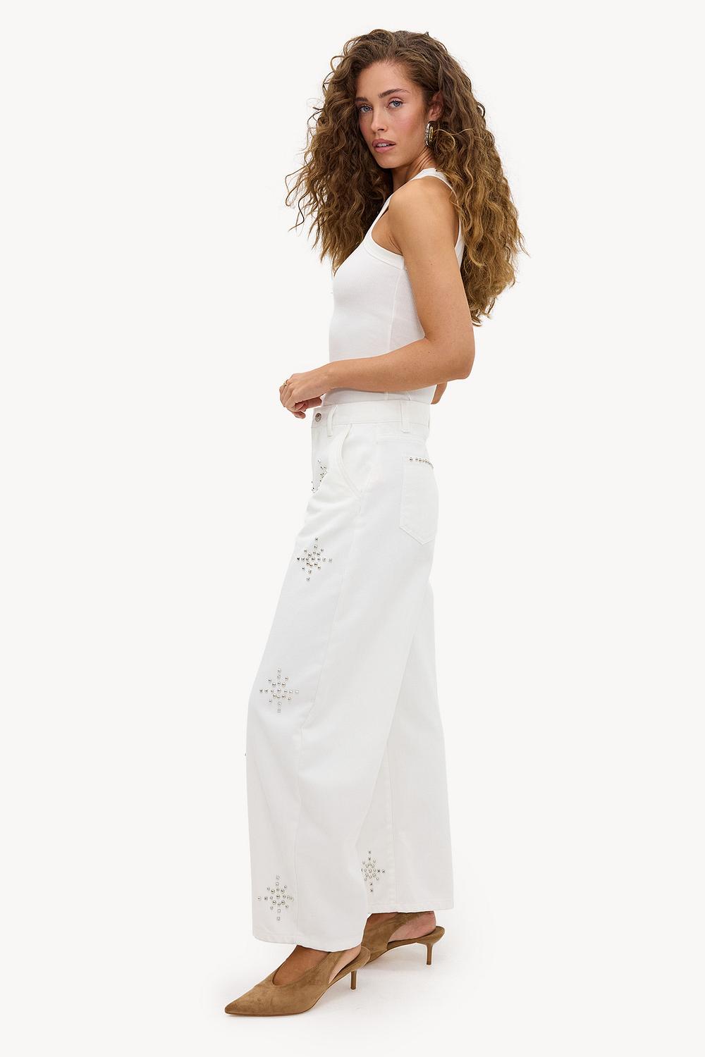 Jean ballon blanc avec strass 59,99 €Ce jean large blanc cassé présente des détails de clous saisissants en motifs d'étoiles partout pour un look audacieux. La coupe taille haute avec des jambes larges crée une apparence décontractée mais chic. Les clous subtils donnent à ce pantalon en denim une touche luxueuse parfaite pour une soirée entre filles.