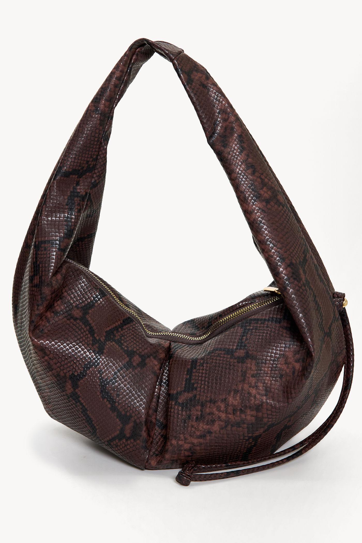 Ce sac à bandoulière marron foncé présente un imprimé serpent saisissant pour un look affirmé. La forme incurvée avec une bandoulière confortable crée une touche moderne au design classique du hobo. Les dimensions spacieuses rendent ce sac parfait pour un usage quotidien.