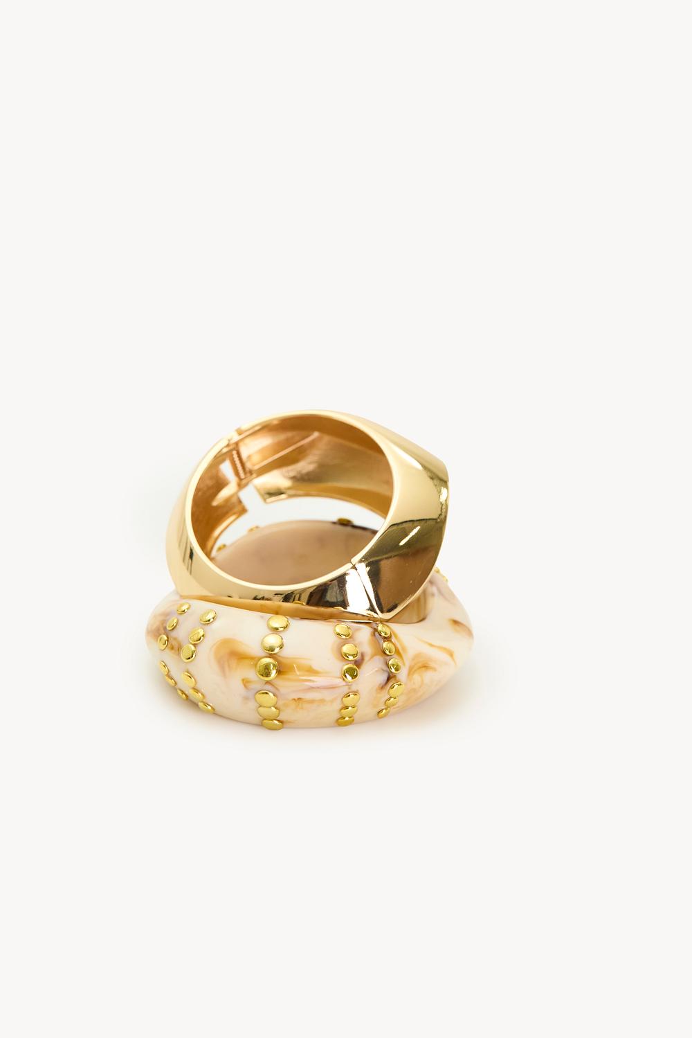 Cet ensemble de bracelets dorés combine une bracelet dorée lisse avec une variante blanc cassé avec des clous dorés. Les bracelets, en acier inoxydable plaqué or à 100%, ont un design épais pour un look affirmé. Stylez ces bracelets ensemble pour une apparence superposée luxueuse ou portez-les séparément pour une touche subtile.