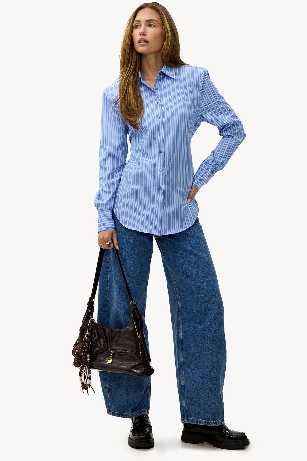 Blouse bleue à rayures avec détail nœud 49,99 €Cette blouse bleue à boutons présente un motif à rayures classiques pour un look intemporel. La coupe ajustée avec manches longues, épaulettes et col classique crée une apparence chic. La fermeture à boutons à l'avant et les détails subtils donnent à cette blouse une touche professionnelle. Associez cette blouse à un jean large pour un look de bureau décontracté.