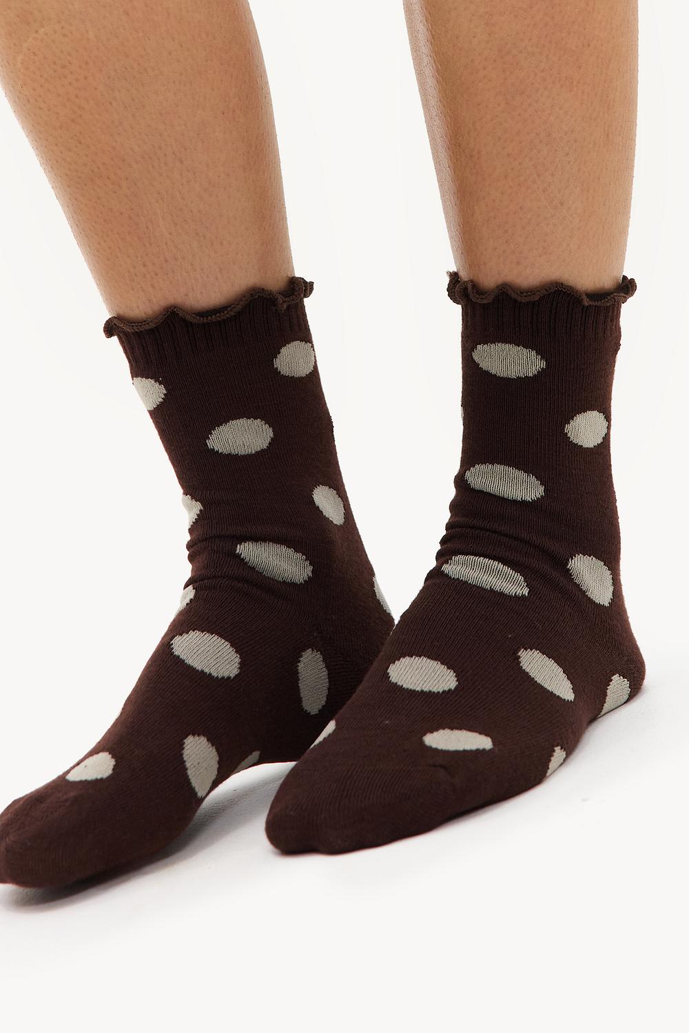 Ces chaussettes rose clair et marron présentent un imprimé à pois sur toute la surface pour une touche cool à votre jeu de chaussettes basique. Les détails à volants en haut ajoutent une touche féminine supplémentaire. La qualité du coton assure confort et douceur.