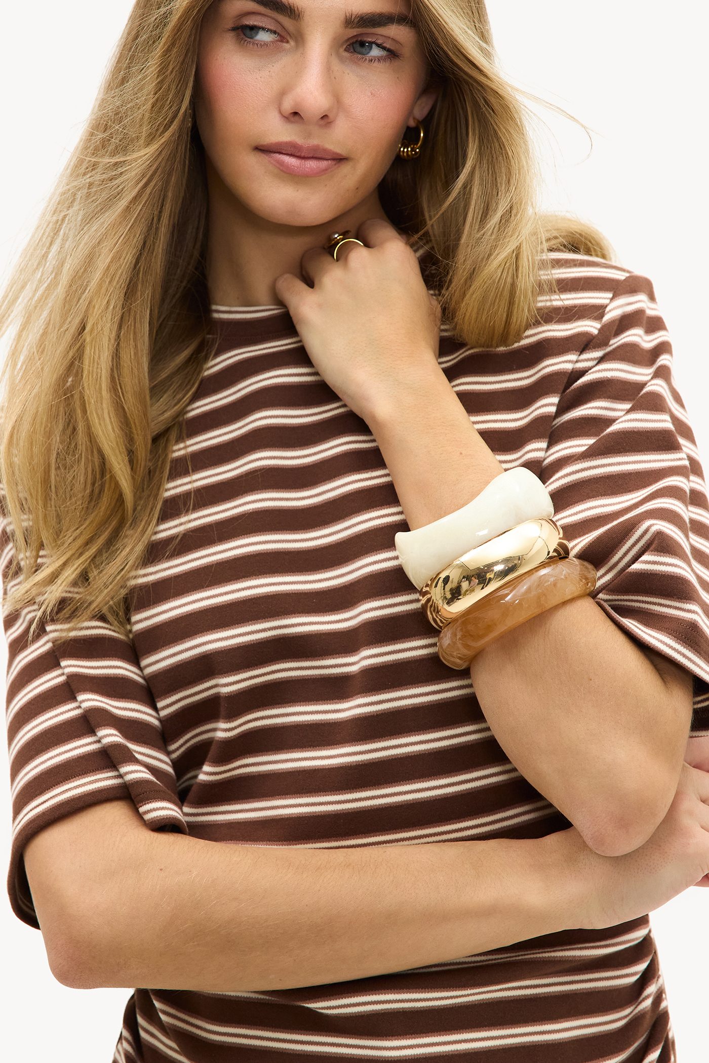 Lot de bracelets 3-pack 19,99 €Cet ensemble de bracelets statement combine trois textures différentes dans des tons nude et or chauds. L'ensemble comprend un bracelet doré brillant, une variante beige mate et un bracelet nude transparent pour un look varié. La finition plaquée or en acier inoxydable de haute qualité assure durabilité et apparence luxueuse. Portez ces bracelets ensemble pour un effet empilé ou individuellement pour un accent subtil.