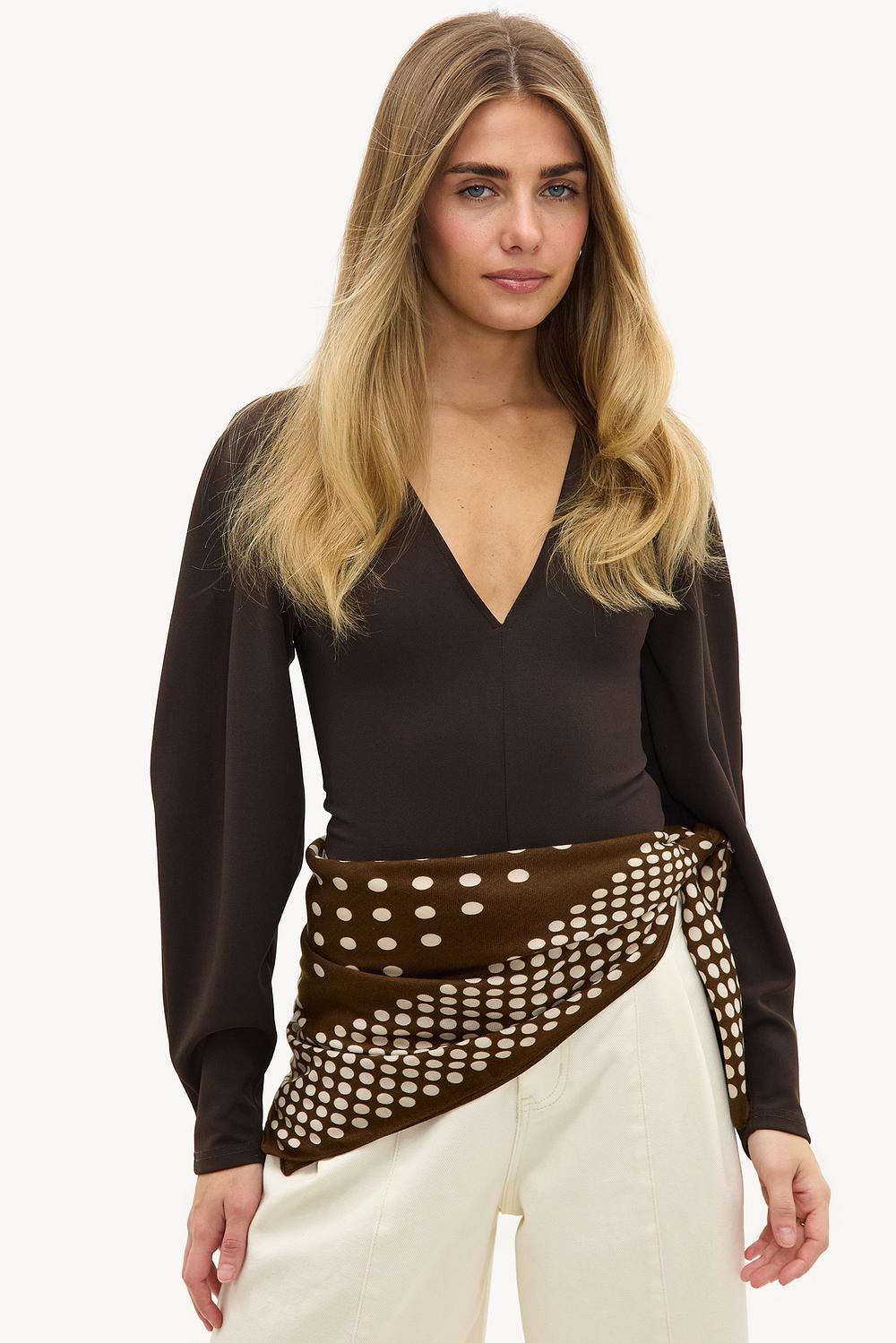 Cette écharpe marron présente un imprimé à pois frappant avec des points blancs de différentes tailles. Le design crée une déclaration moderne lorsqu'il est porté comme une ceinture. La qualité douce du polyester assure confort et un aspect luxueux. Stylisez cette écharpe autour de votre taille pour une touche chic à votre tenue.