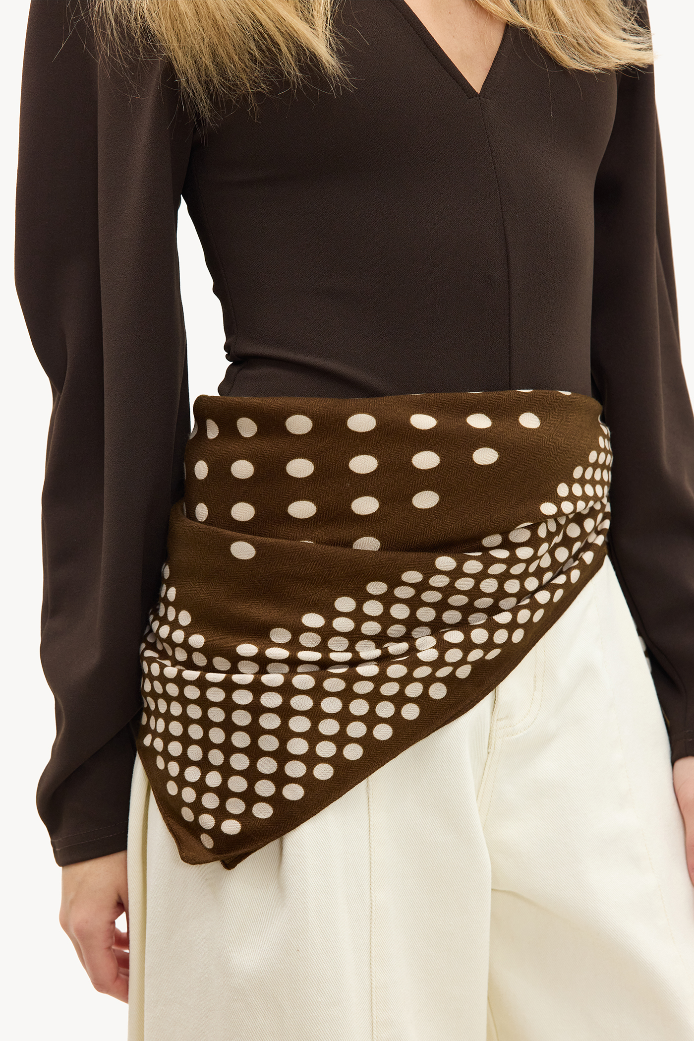 Cette écharpe marron présente un imprimé à pois frappant avec des points blancs de différentes tailles. Le design crée une déclaration moderne lorsqu'il est porté comme une ceinture. La qualité douce du polyester assure confort et un aspect luxueux. Stylisez cette écharpe autour de votre taille pour une touche chic à votre tenue.