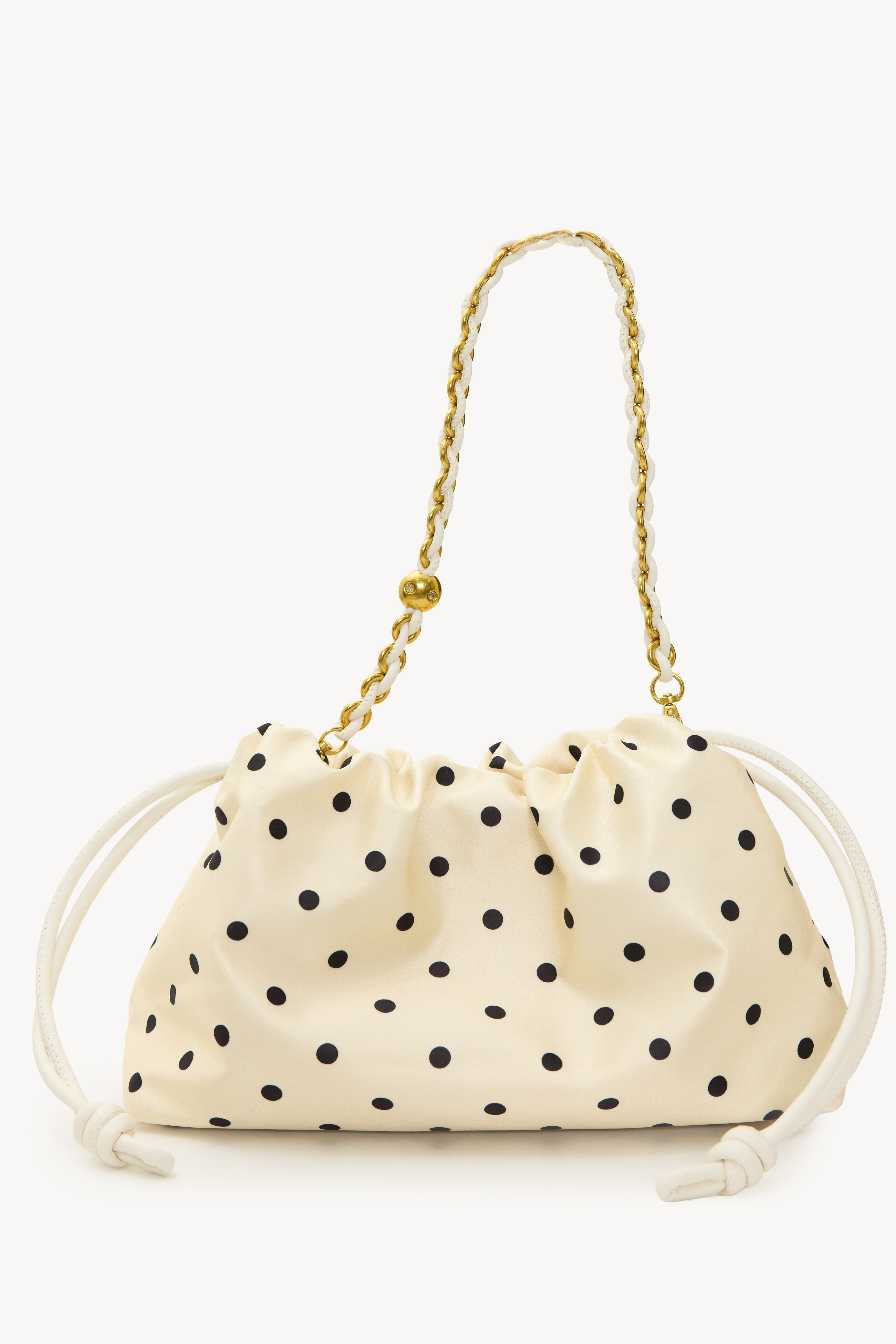 Ce sac à bandoulière blanc cassé présente un imprimé à pois noir pour un look intemporel. La fermeture à cordon douce et la poignée en chaîne dorée donnent au sac une touche luxueuse. La forme compacte est parfaite pour vos essentiels et crée un accent chic avec n'importe quelle tenue. Associez ce sac statement avec un pull oversize pour un look décontracté et cool.