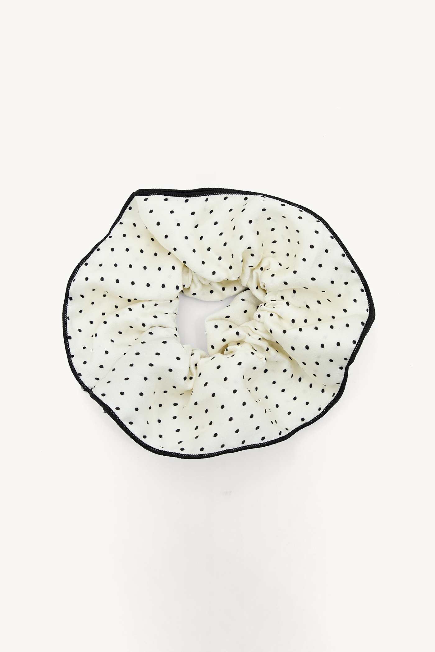 Ce chouchou blanc cassé présente un imprimé à pois avec des points noirs et un bord noir contrastant. Le matériau en polyester doux assure un confort lors du port. La forme volumineuse donne à vos cheveux une belle tenue sans être trop serrée. Parfait pour donner à vos looks décontractés une touche vintage.