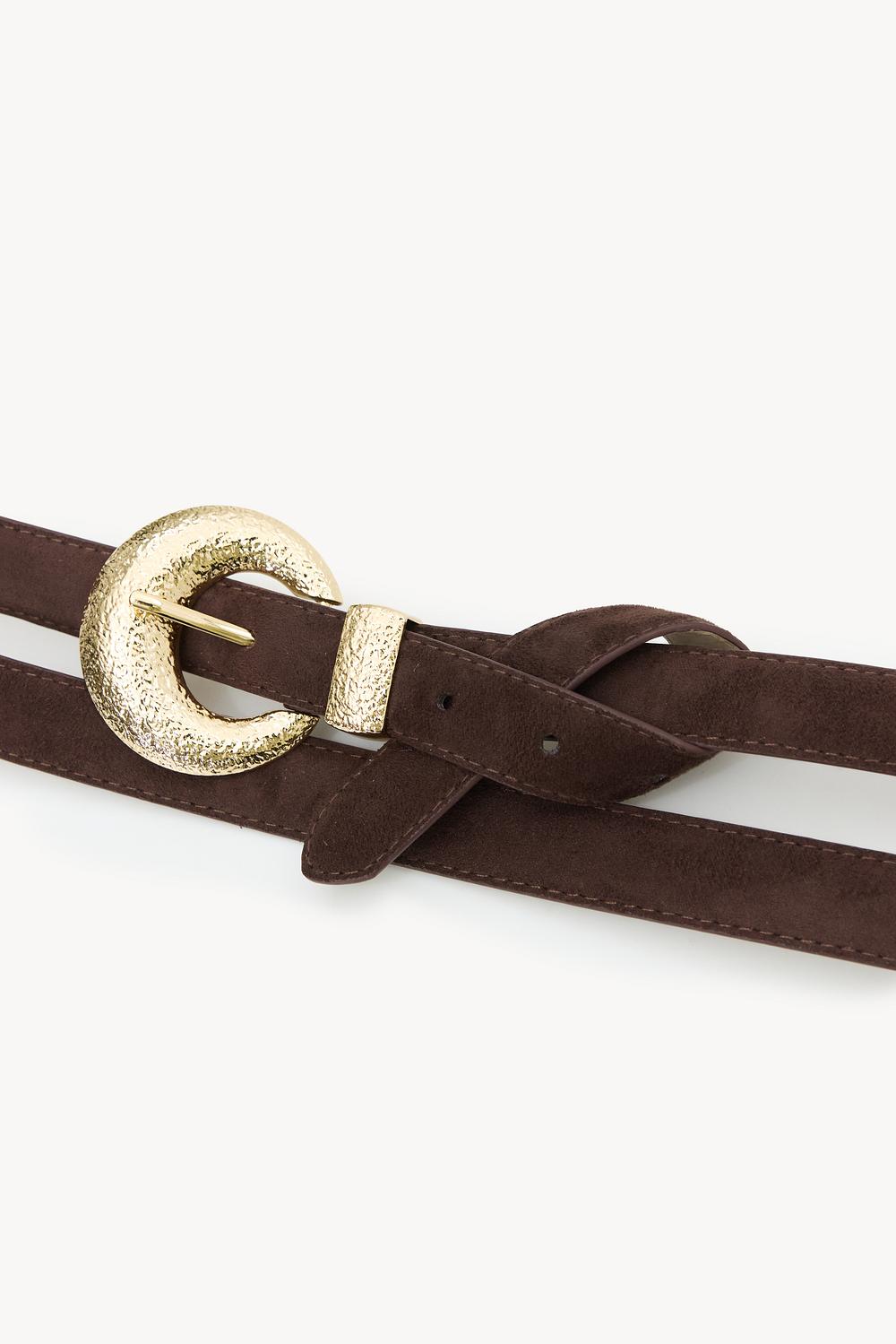 Cette ceinture marron foncé effet suédé présente une boucle dorée statement avec une finition texturée. La coupe large avec un dos élastique assure un ajustement confortable et une flexibilité supplémentaire. Les détails en métal doré donnent à cette ceinture une touche luxueuse. Portez cette ceinture sur un blazer oversize pour un look chic.